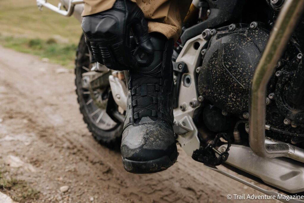 Les bottes « trail » sont conçues dans un esprit de polyvalence : elles doivent protéger jusqu’au haut du tibia tout en restant suffisamment confortables pour être portées toute une semaine de voyage. Résultat : elles sont souvent souples, tant au niveau de la semelle que des renforts. À l’inverse, les bottes d’enduro offrent une protection bien supérieure, avec une semelle ultra rigide et une structure renforcée — un vrai atout quand une moto de plus de 250 kg vient s’écraser sur le pied. Un choix à assumer en fonction de votre pratique.