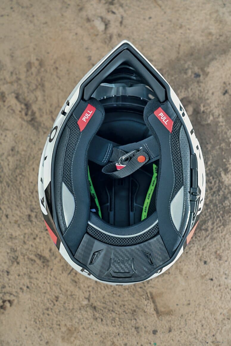 Si l’on appréciait un peu moins son confort spartiate, sachez que cette version du Airoh Commander 2 corrige principalement ce défaut, tout en apportant des améliorations notoires. Désormais facilement démontable, les mousses sont nettement plus soyeuses autour des joues et du crâne. L’enfilage a lui aussi été facilité grâce au supplément de souplesse apporté par l’abandon de la structure en polystyrène : fini le mal aux oreilles pour ceux qui en souffraient sur la V1 ! Ses mousses bénéficient d’ailleurs d’un système d’extraction aisé (AEFR), pour faciliter le travail des secours en cas d’accident.
