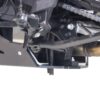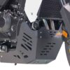 Le carter moteur est sécurisé contre les chocs grâce à un renfort de 30 mm d’épaisseur à l’avant et un autre soutien sur la poutre arrière, empêchant ainsi les enfoncements. En façade, la pompe à eau est protégée par le sabot qui remonte suffisamment haut pour la couvrir des projections. ce sabot est compatible avec les crash bars SW Motech – Honda – Hepco & Becker, mais pas compatible avec la béquille centrale Honda. Enfin pour information, la matière PEHD utilisé par AXP à aussi la particularité de reprendre sa forme initiale après les impacts: un gage de durabilité.