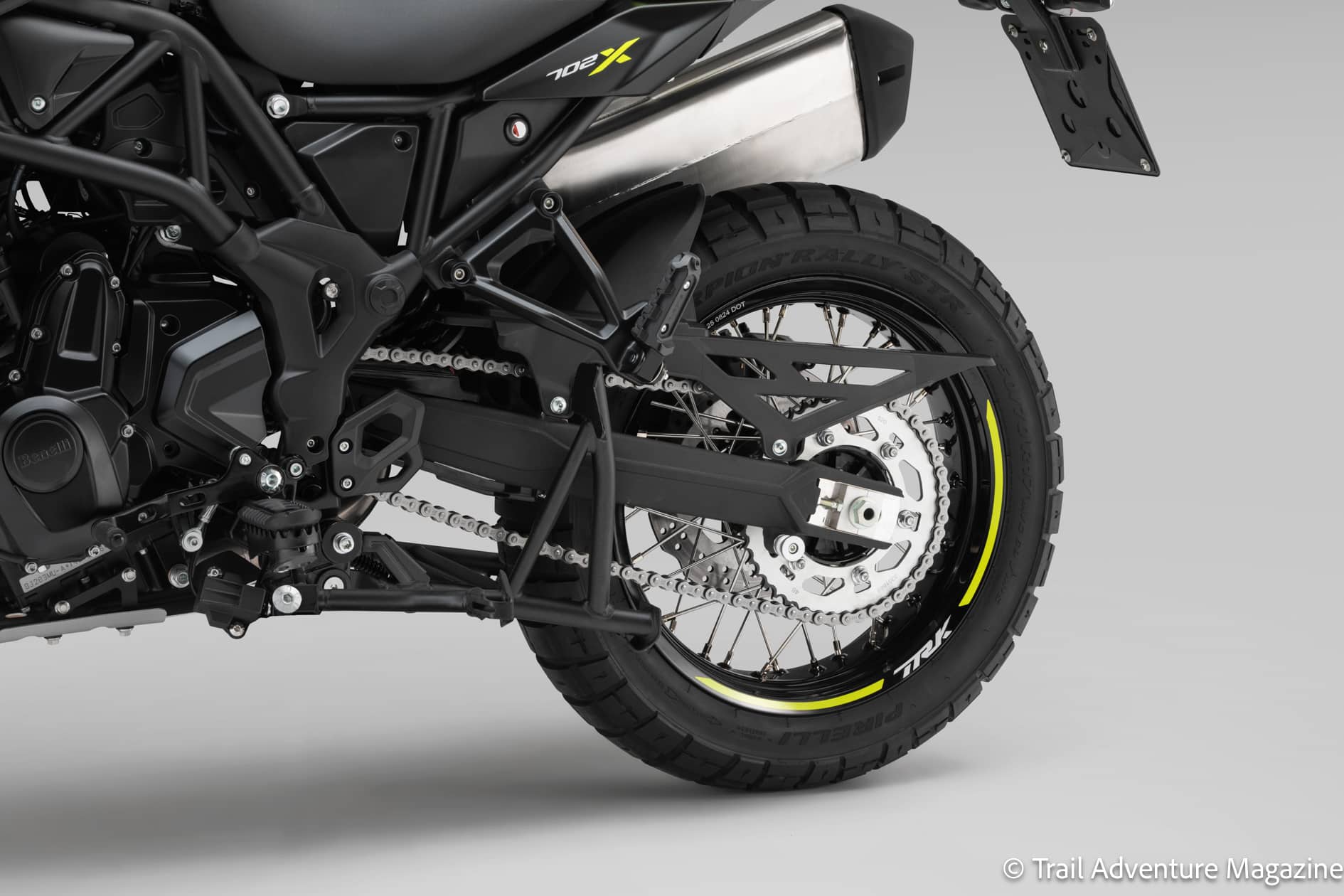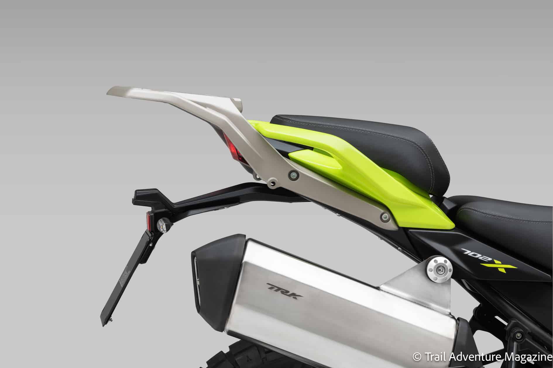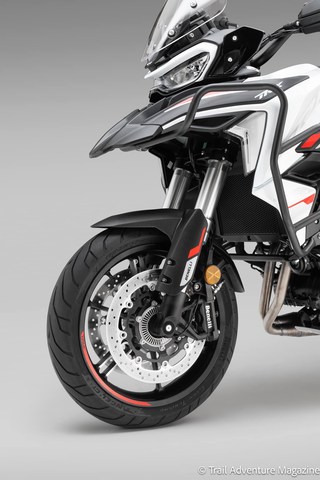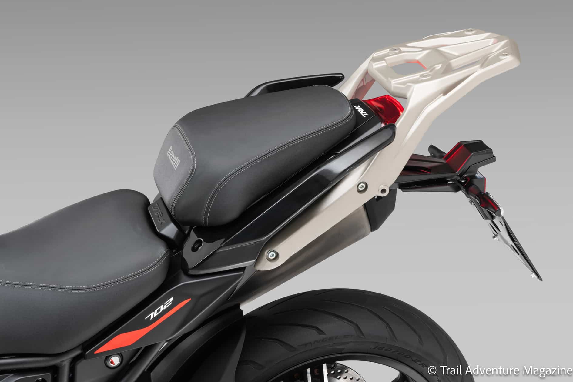 La TRK 702 privilégie une vocation routière, avec des jantes en 17 pouces chaussées de pneus Pirelli Angel GT et une hauteur de selle de 790 mm.