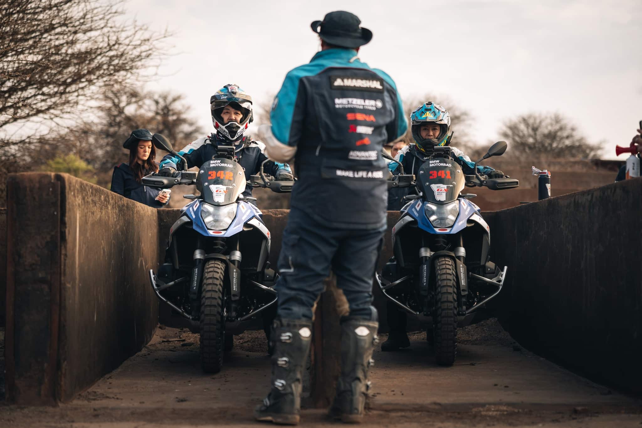 Près des ruines d’une ancienne mine de cuivre, les participants ont aligné leurs motos au point de départ. Le premier pilote s’est élancé, marquant le début du chronométrage, suivi des deux autres (ou un seul pour une équipe féminine) après un intervalle de cinq secondes. Ils ont dû naviguer sur un sentier étroit parsemé de sable, d’obstacles, de descentes et de virages serrés. À la fin du parcours, ils devaient garer leurs motos et courir vers l’entrée fermée de la mine pour sonner une cloche, arrêtant ainsi le chronomètre. Ce défi, pensé comme un échauffement pour les équipes et les Marshals, a surpris de nombreux pilotes par la difficulté de ses passages étroits.