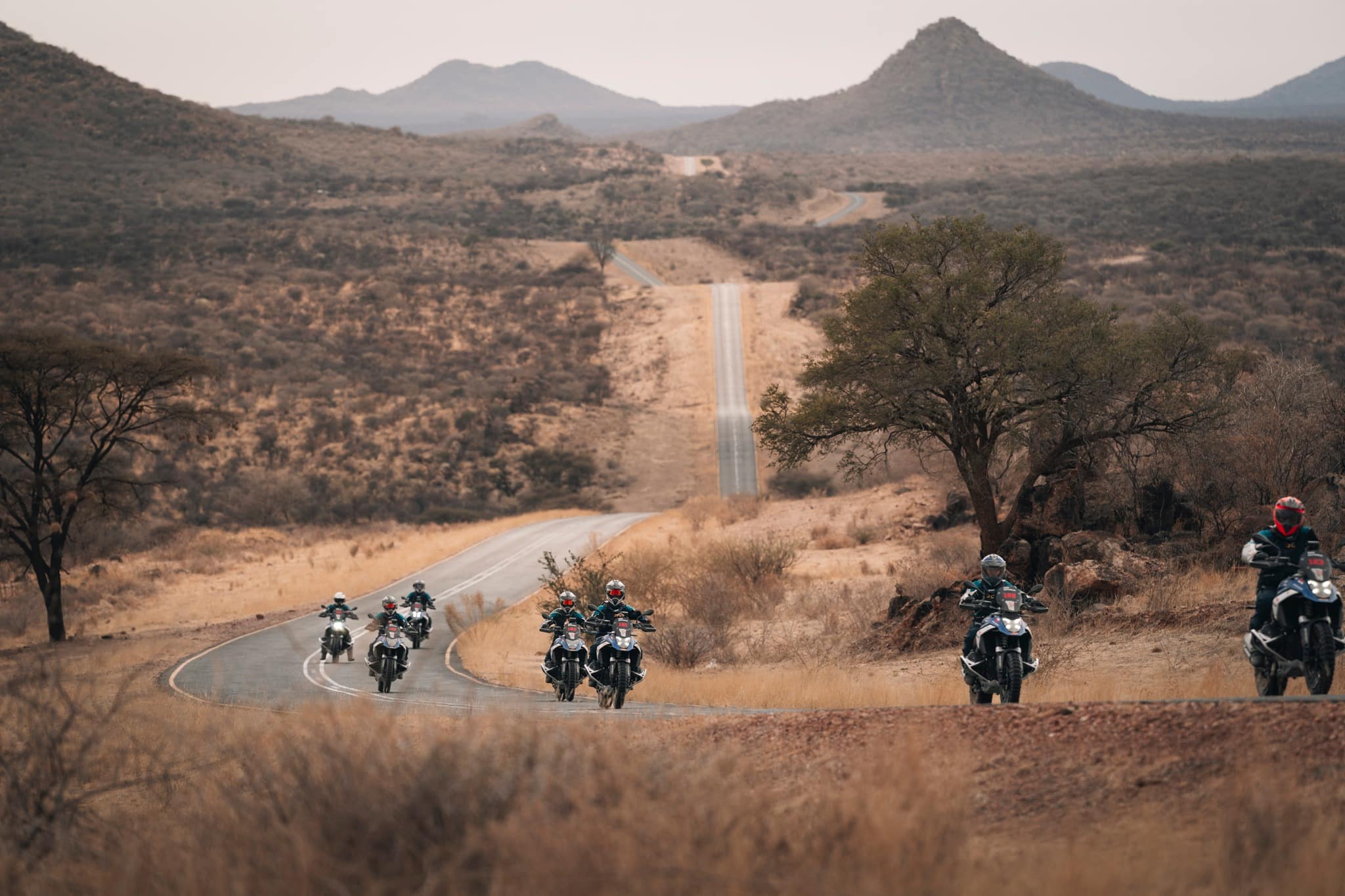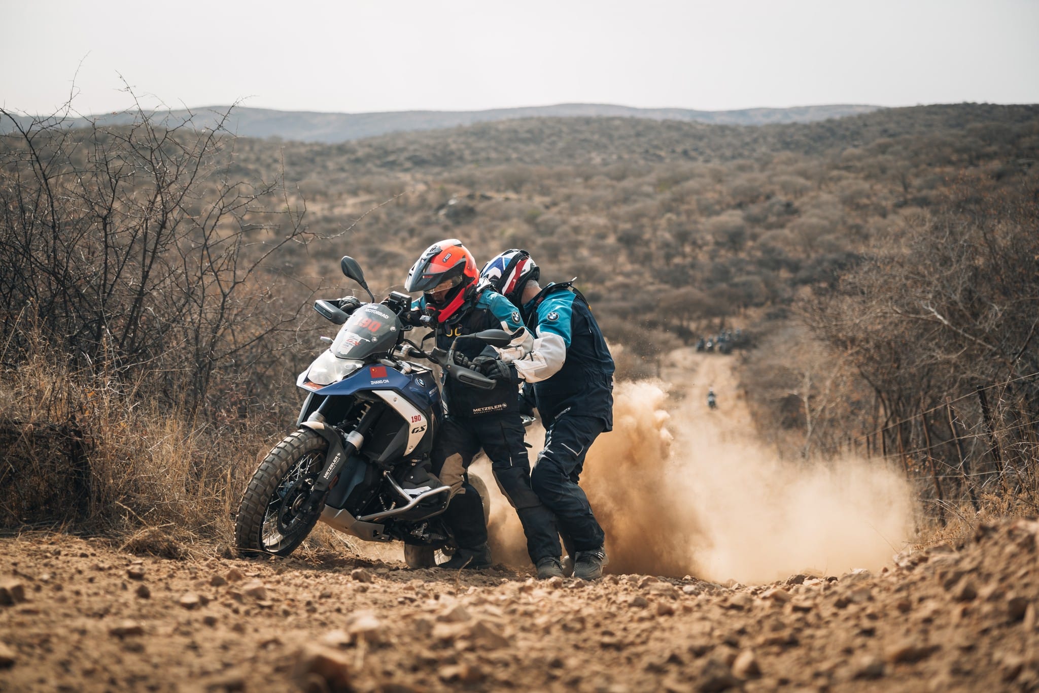 Les compétiteurs, regroupés en groupes de 7 à 9 motos et guidés par leurs Marshals désignés, ont entamé la première journée et leur tout premier défi spécial. À quelques kilomètres seulement du Midgard Country Estate Lodge, encore sur le domaine, les pilotes se sont retrouvés face au premier **défi spécial : Le Trial de bienvenue en Namibie.