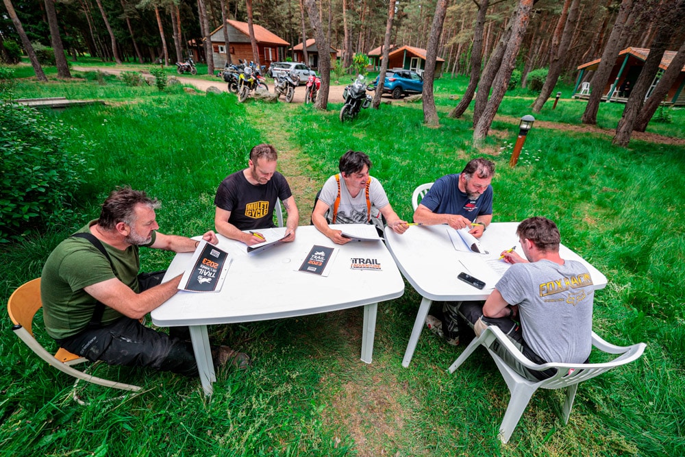 10 rouleurs surmotivés et 10 machines de rêves… enfin 9. Il fallait donc plusieurs jours pour rouler sur les traces effectuées par le local de l’étape, Pierre Pallut, qui réalise les road-books des Trail Adventure Days. A l’issu de ces journées de roulage, tous les électeurs avaient un petit formulaire pour noter les candidates. Les huissiers de justice Patrick et François ont scellé les urnes à coups de chewing-gums et effectué les délibérations au bureau afin de déterminer : quel est le trail de l’année 2023 ?