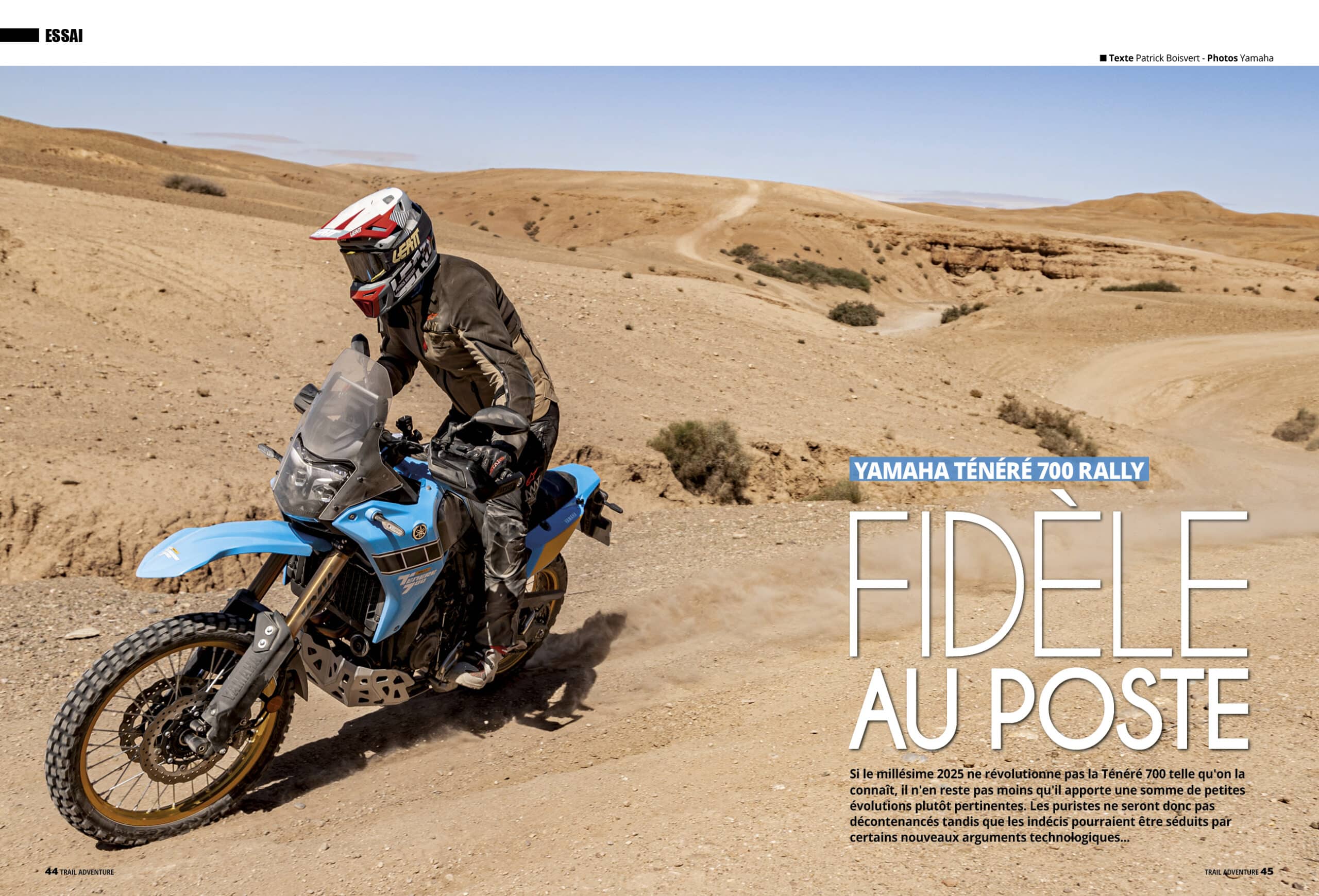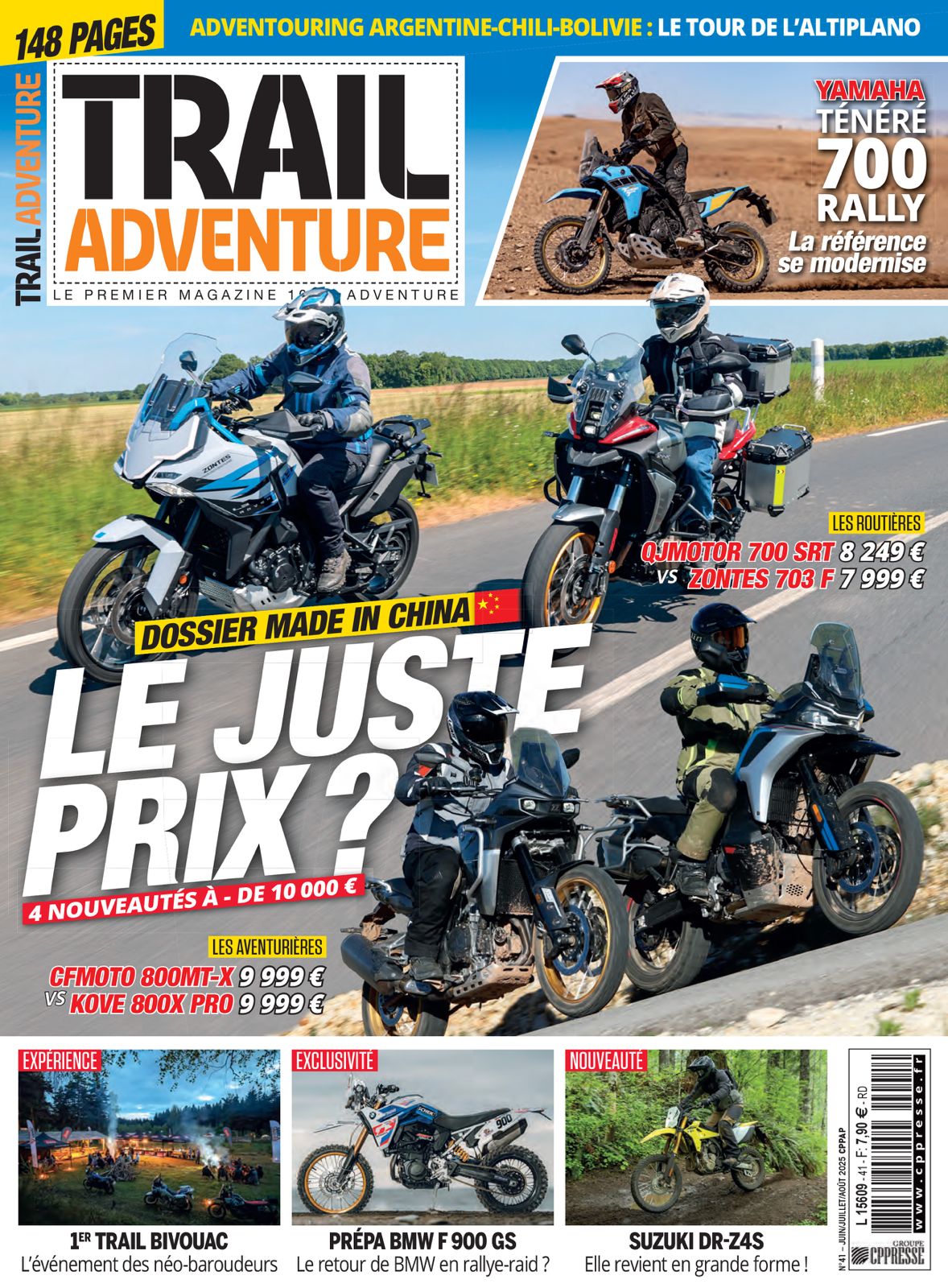 Eh bien, c’est justement pour susciter toutes ces émotions que nous construisons, avec passion, ce magazine. Car nous aussi, nous frissonnons lorsque, comme vous, nous apprenons que KTM repart de plus belle, sauvé par les Indiens de chez Bajaj. Nous frétillons en redécouvrant la passion intacte des ingénieurs japonais pour leur petit monocylindre ressuscité lors de l’essai de la toute nouvelle DR-Z4S en Oregon. Comme vous, nous doutons lorsque nous emmenons quatre trails chinois sur les routes et les chemins de France, pour les mettre en avant comme jamais nous n’avons osé le faire auparavant. Nous tremblons quand Patrick nous livre son avis tranché sur la nouvelle Ténéré qu’il connaît si bien, après un test au Maroc. Nous vibrons enfin lorsque nous roulons dans la roue de Jacopo Cerutti et son Aprilia de rallye, à l’occasion du lancement de la nouvelle Tuareg 660.