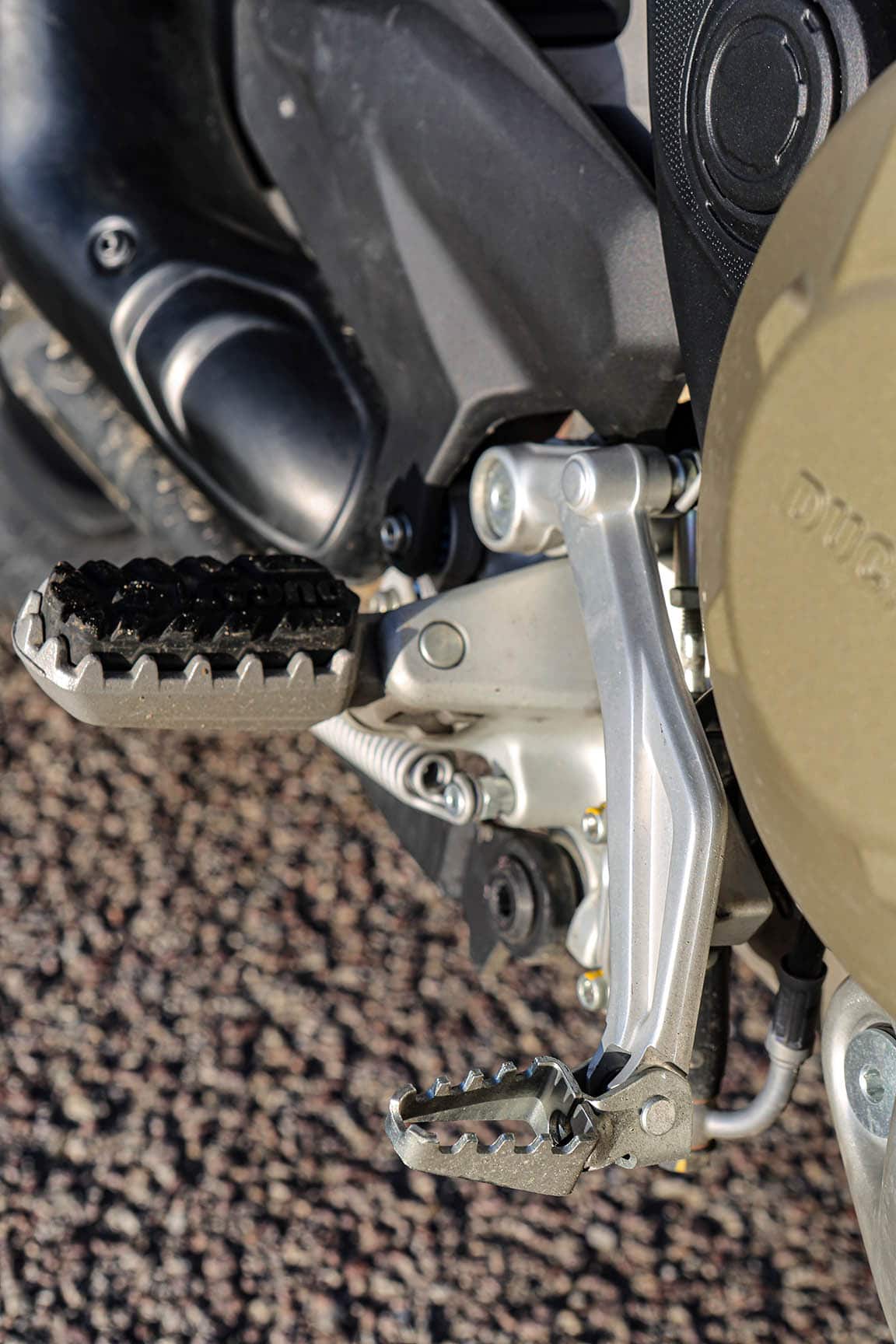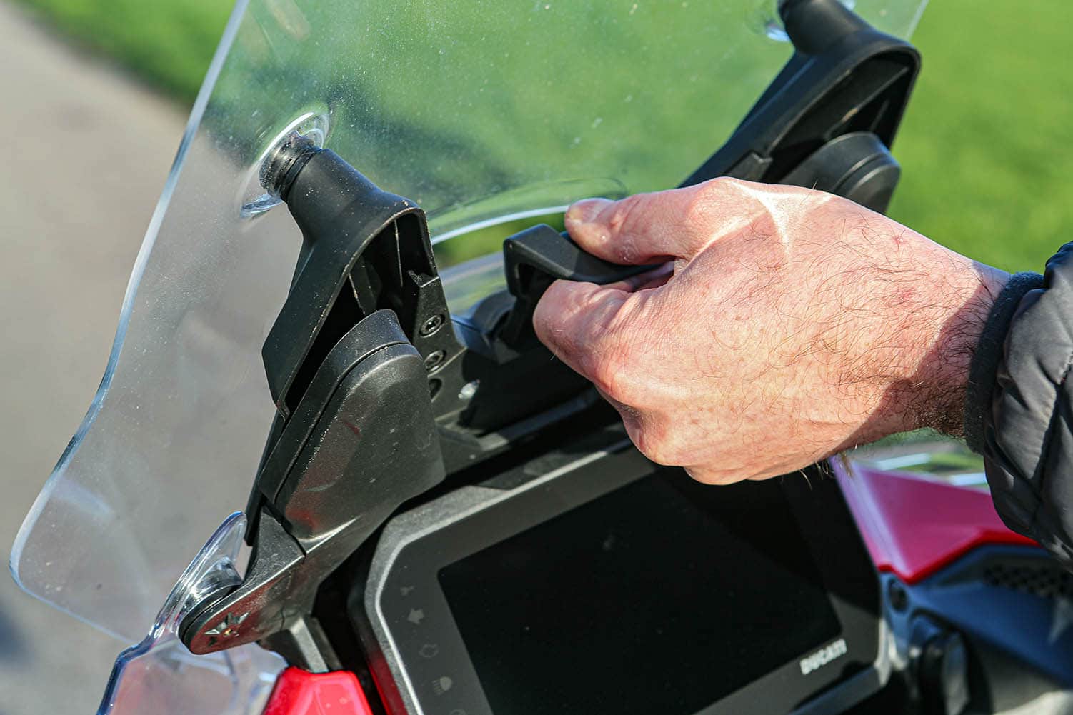 Ducati Multistrada V4 SMalgré un large radiateur d’eau et un gros réservoir de 22 litres, la nouvelle Multistrada ne paraît pas si imposante que cela. Lignes racées, habillage finement élaboré, radar avant bien intégré, bec de canard raboté : la V4S est attirante. Seul regret : le bras oscillant est de type classique et non plus un classieux monobras comme avant. Dommage. Reste que la position de conduite représente un modèle de compromis : le cintre du guidon n’est ni trop large, ni trop étroit et la machine se révèle très fine entre les jambes et moins large que ce qu’on aurait pu redouter. Cette Multistrada V4 devrait d’autant plus correspondre à différents gabarits que la hauteur de selle se règle à 84 ou 86 cm sans outil. Leviers, pédales, rétroviseurs, mécanisme de réglage du pare brise, logique de commande des fonctions électroniques, commandes des poignées et selles chauffantes (option) : tout est personnalisable, bien conçu.