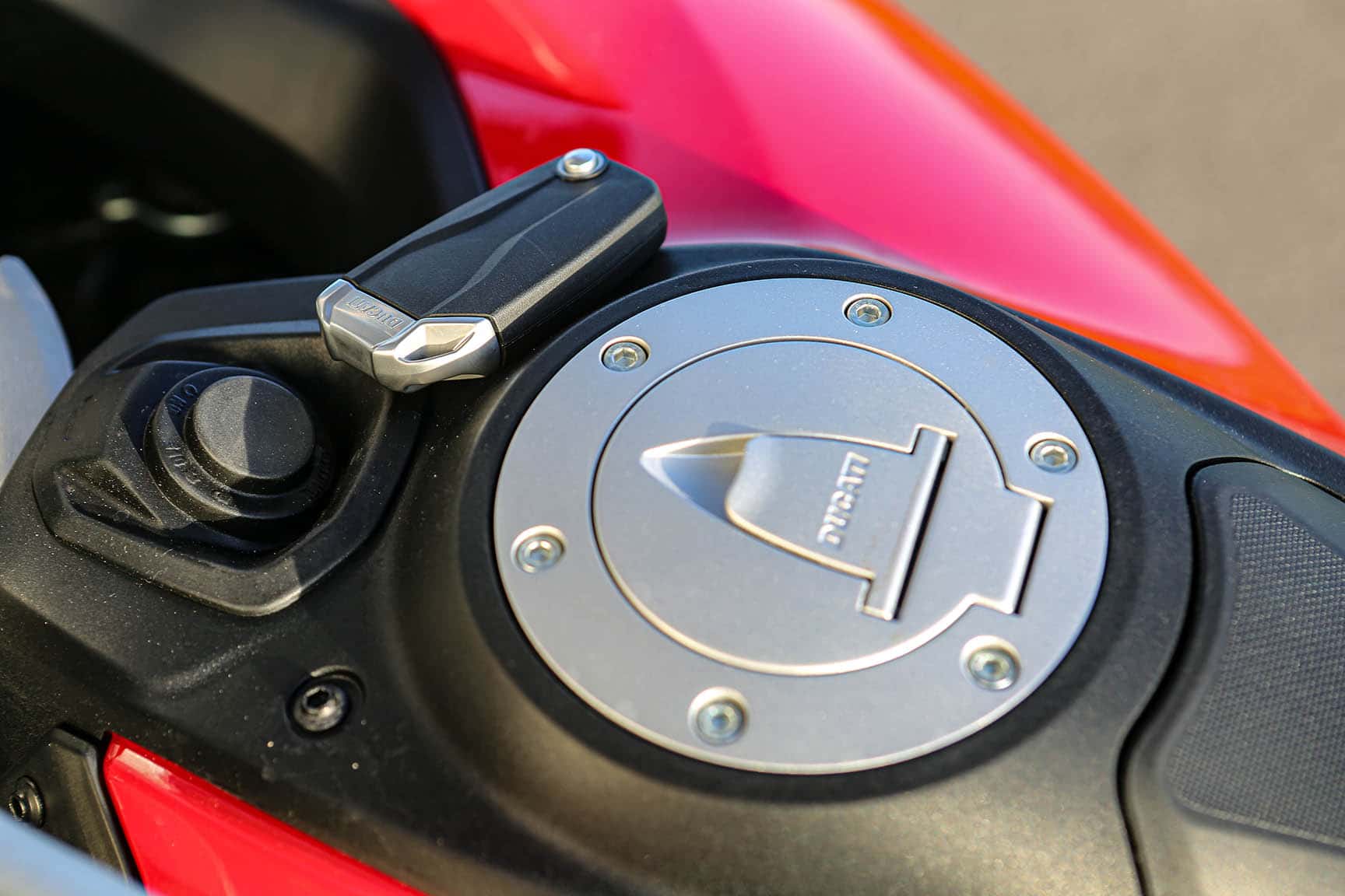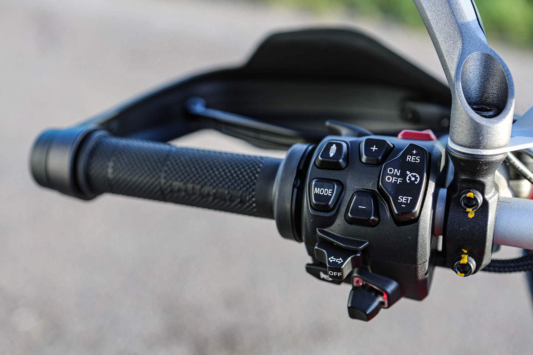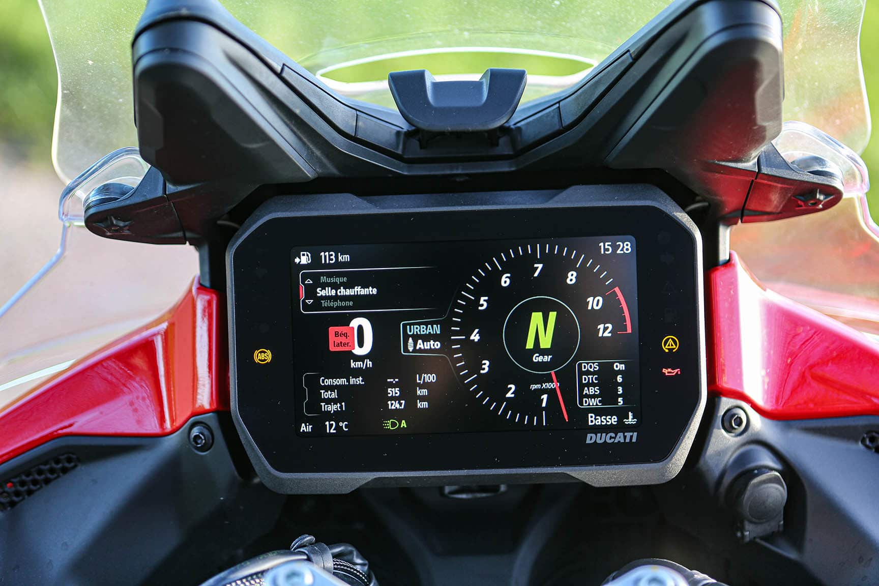 Comme chez la concurrence, le trail italien se décline en plusieurs versions : standard, V4 S et V4 S Sport. Ces deux dernières disposent d’un tableau de bord avec écran TFT 6,6 pouces, de suspensions pilotées, le dispositif de démarrage sans clé et un shifter. La S Sport pousse le bouchon encore un peu plus loin en se dotant d’un coloris tricolore spécifique, d’un garde boue avant en carbone et d’un silencieux Akrapovic. Ces versions haut de gamme sont  aussi les premières motos du marché à recevoir un régulateur de vitesse adaptatif, avec deux caméras. La première, placée à l’avant de la moto, intervient automatiquement sur le régulateur de vitesse quand vous vous approchez trop près du véhicule qui vous précède. La seconde, à l’arrière, détecte l’arrivée d’un véhicule derrière vous et vous indique sa présence avec un signal lumineux intégré dans le rétroviseur.