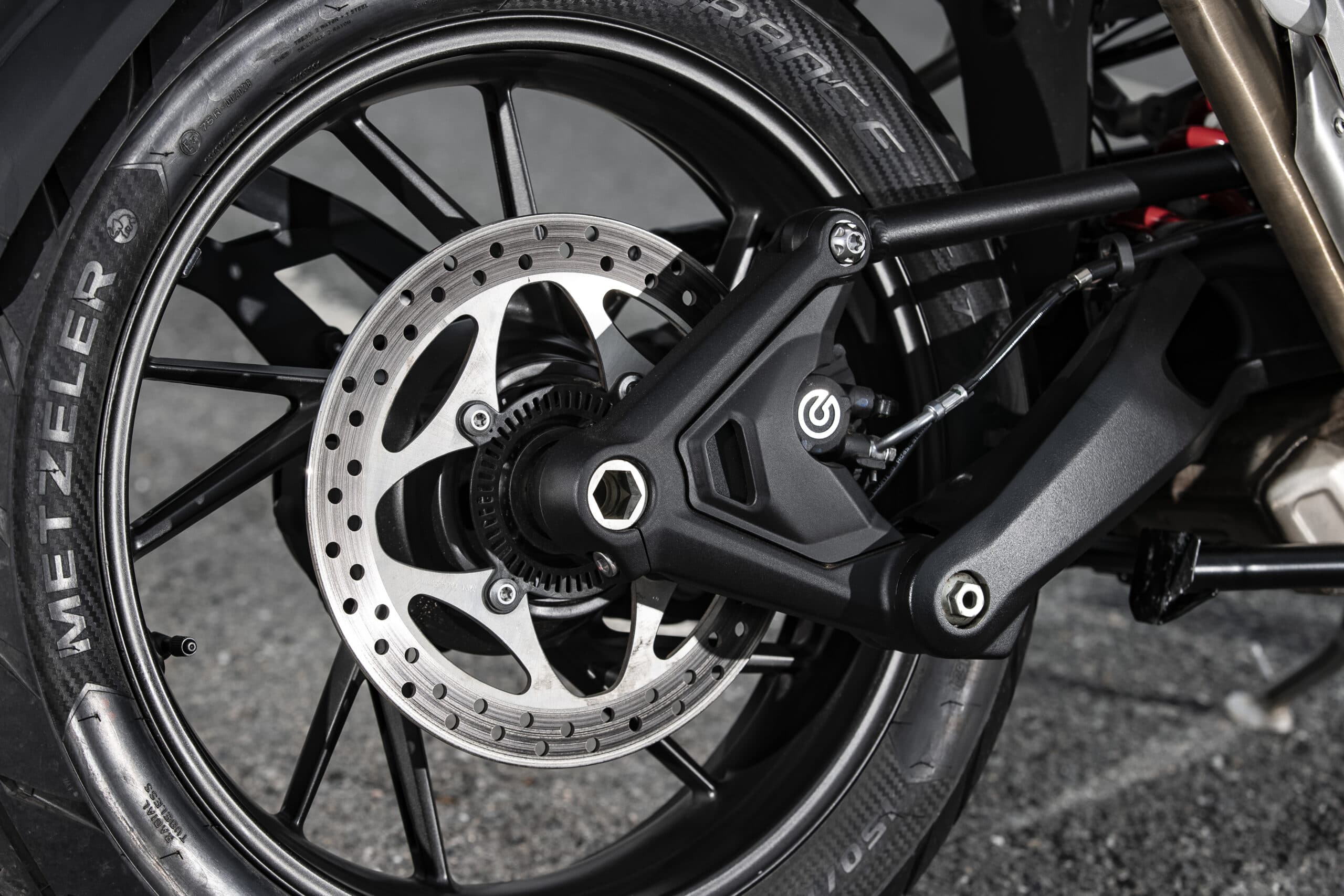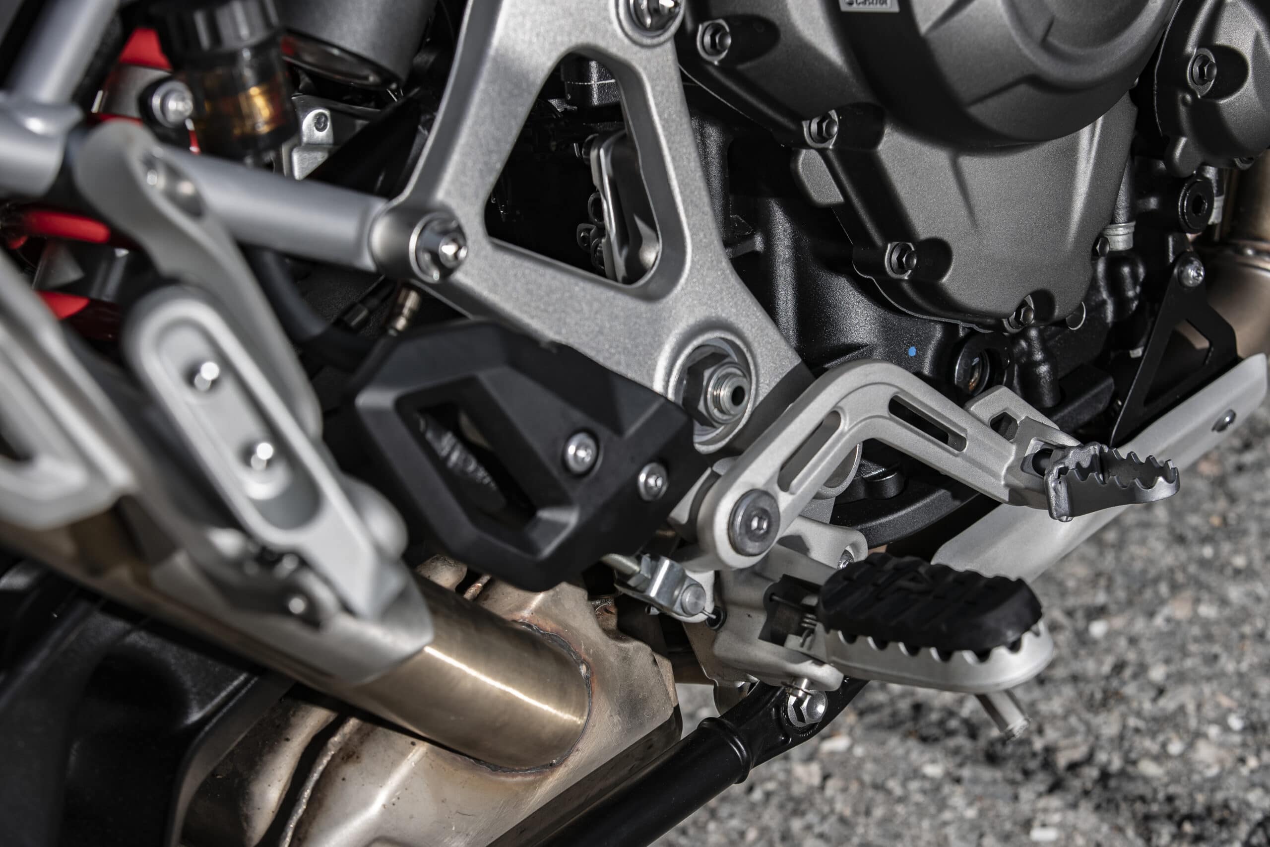 Autre première chez Triumph : fini la roue de 17 pouces à l’arrière ! La jante est désormais d’un diamètre de 18 pouces. La dimension de la jante avant évolue toujours et est désormais disponible en 21 pouces (rayons/tubeless) pour les modèles orientés Rally. Les modèles GT conservent quant à eux une jante à bâtons de 18 pouces à l’arrière. Enfin le freinage est confié aux traditionnels étriers monobloc à fixation radiale Brembo Stylema : du très beau matériel.