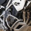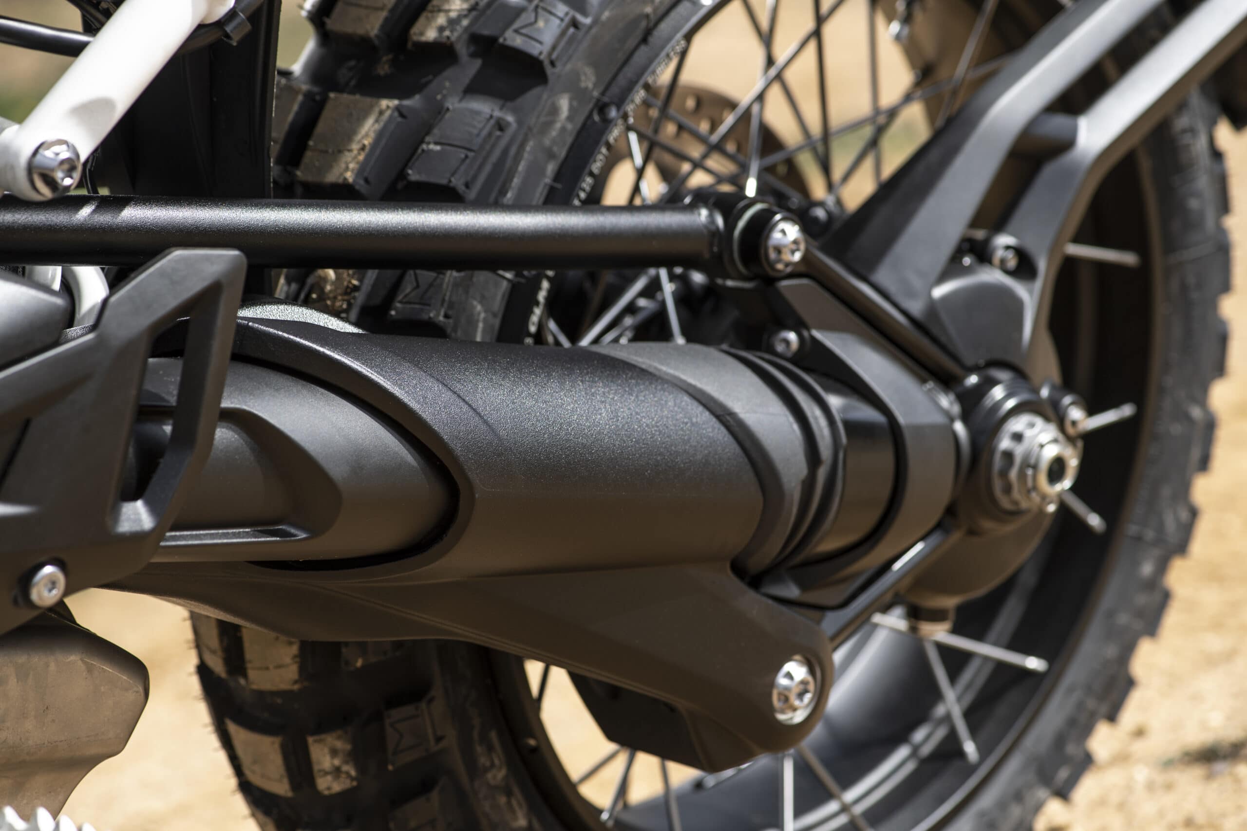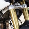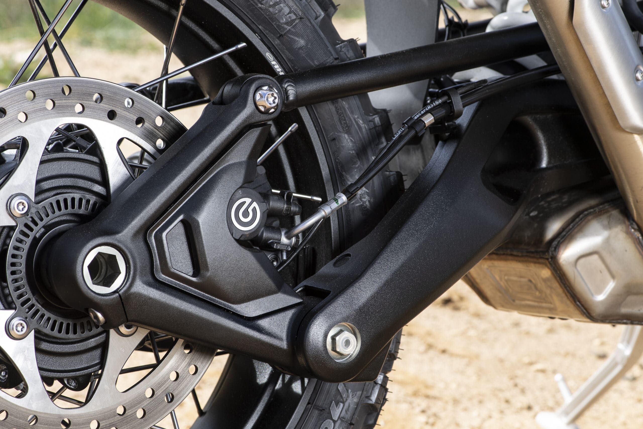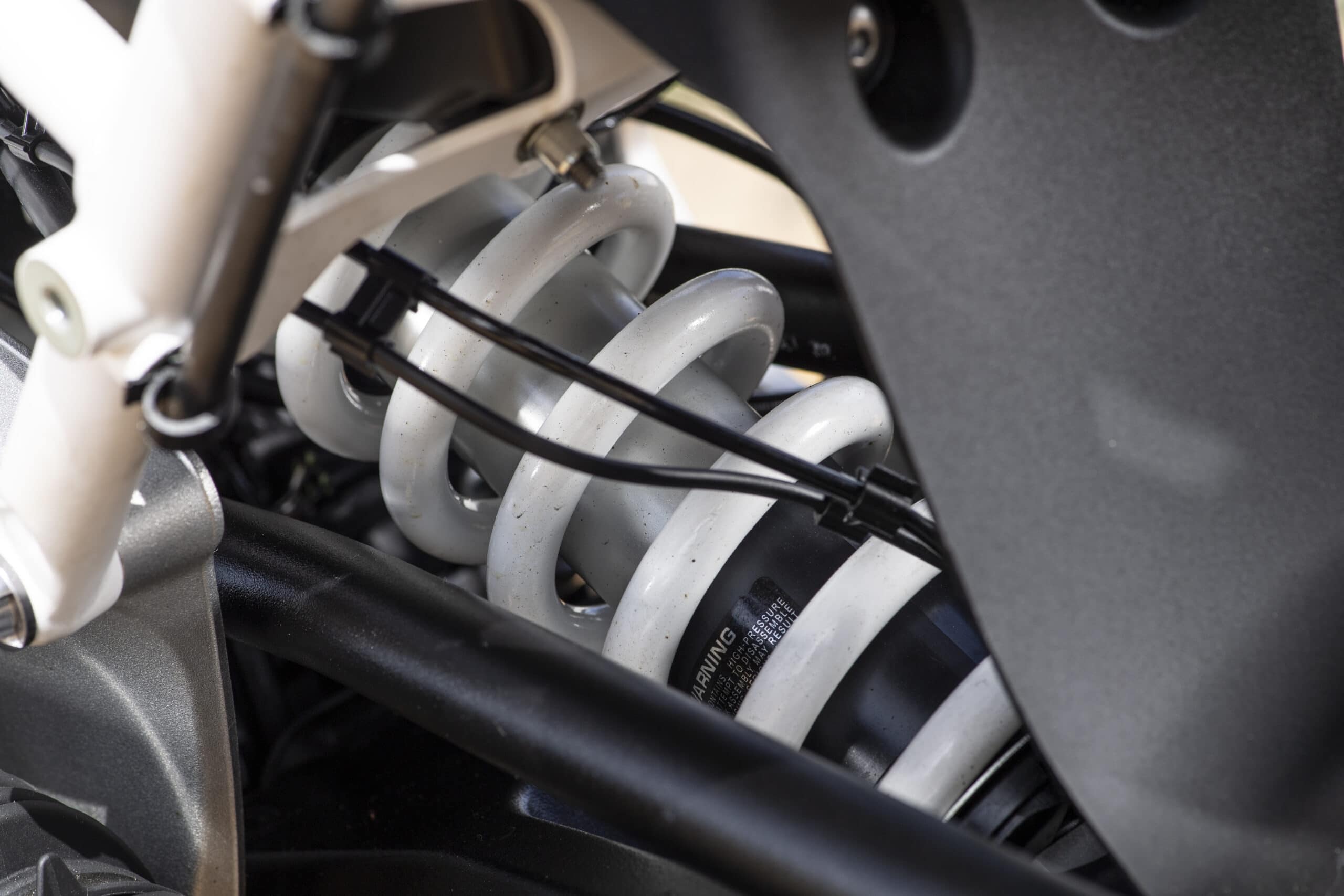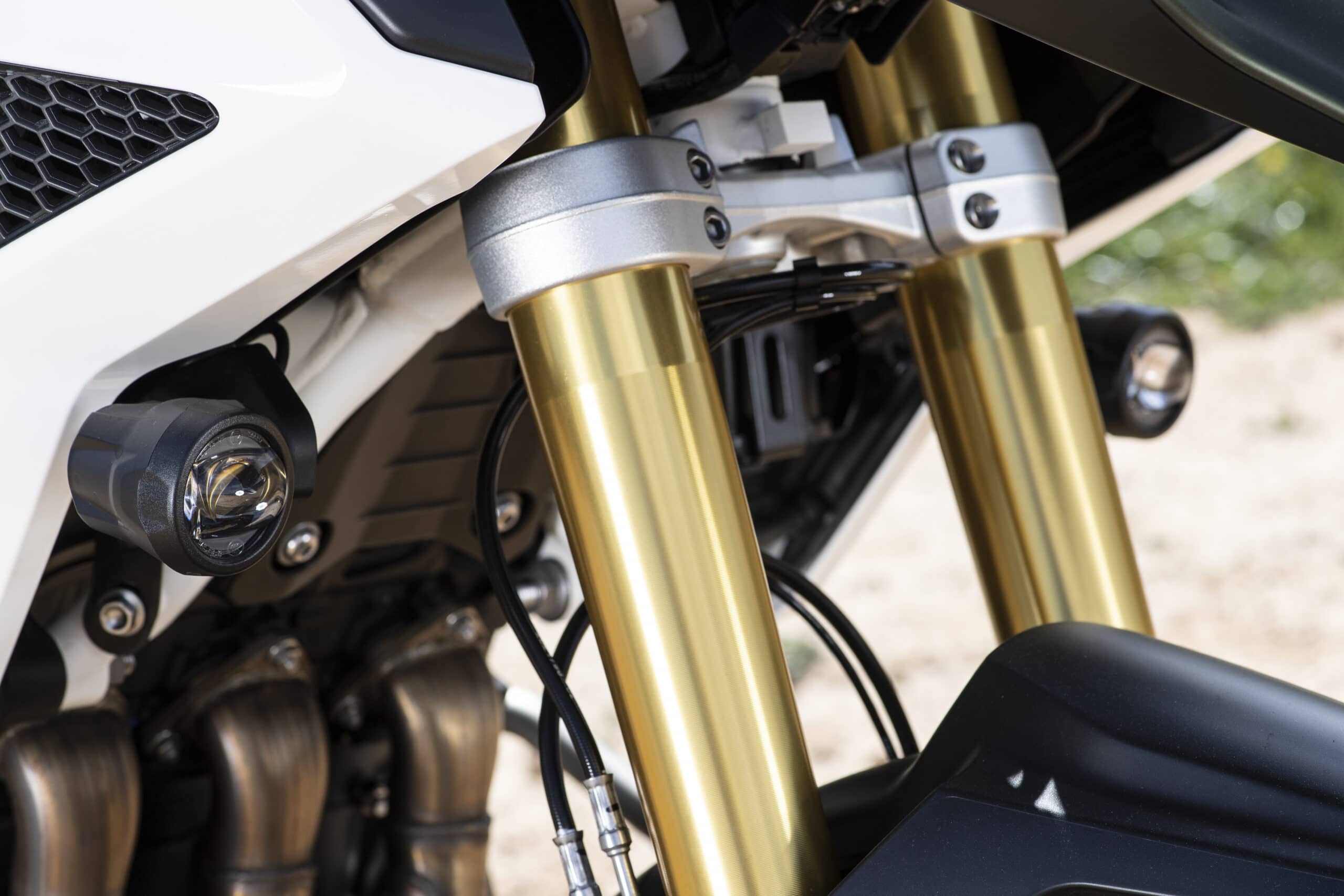 Les suspensions sont confiées au fabricant japonais Showa et utilisent la technologie semi-active « EERA » qu’on retrouve notamment sur les Honda Africa-Twin. L’amortisseur arrière est monté en direct (sans système de biellettes) ce qui permet encore d’économiser de la place et du poids. À l’avant la fourche inversée impressionne par son diamètre : 49 mm. Deux débattements identiques avant/arrière sont proposés en fonction du modèle choisi : 200 mm sur les modèles GT et 220 mm sur les versions Rally.