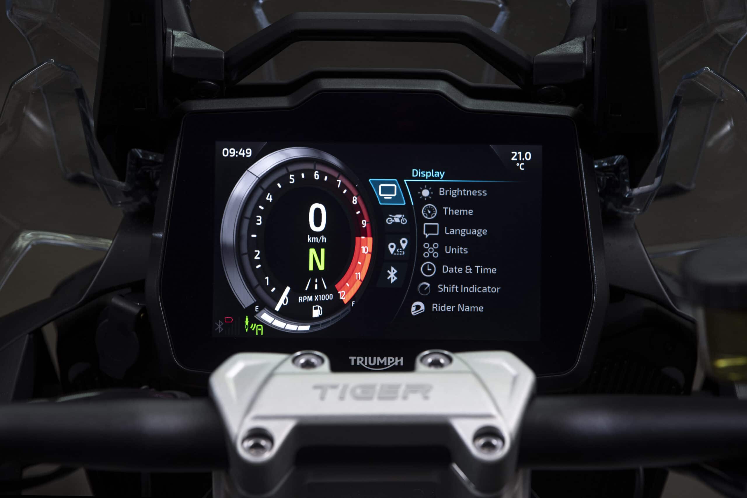 Attention, une Tiger 1200 peut en cacher une autre ! Triumph propose en effet 5 modèles bien distincts, dont deux à l’orientation off-road, et trois à l’orientation plus routière. Les versions Explorer profitent d’un imposant réservoir en aluminium d’une contenance de 30 litres (contre 20 litres sur les versions standard). Elles bénéficient aussi d’un radar situé à l’arrière avec indicateur de dépassement. Et quand on interroge l’équipe Triumph sur l’arrivée du radar avant pour intégrer le régulateur de vitesse adaptatif comme chez Ducati ou KTM, nos interlocuteurs répondent : « Ce n’est pas une demande des clients ». On regrettera aussi l’absence de rangement à l’avant de la machine, comme on en trouve à nouveau chez les concurrents.