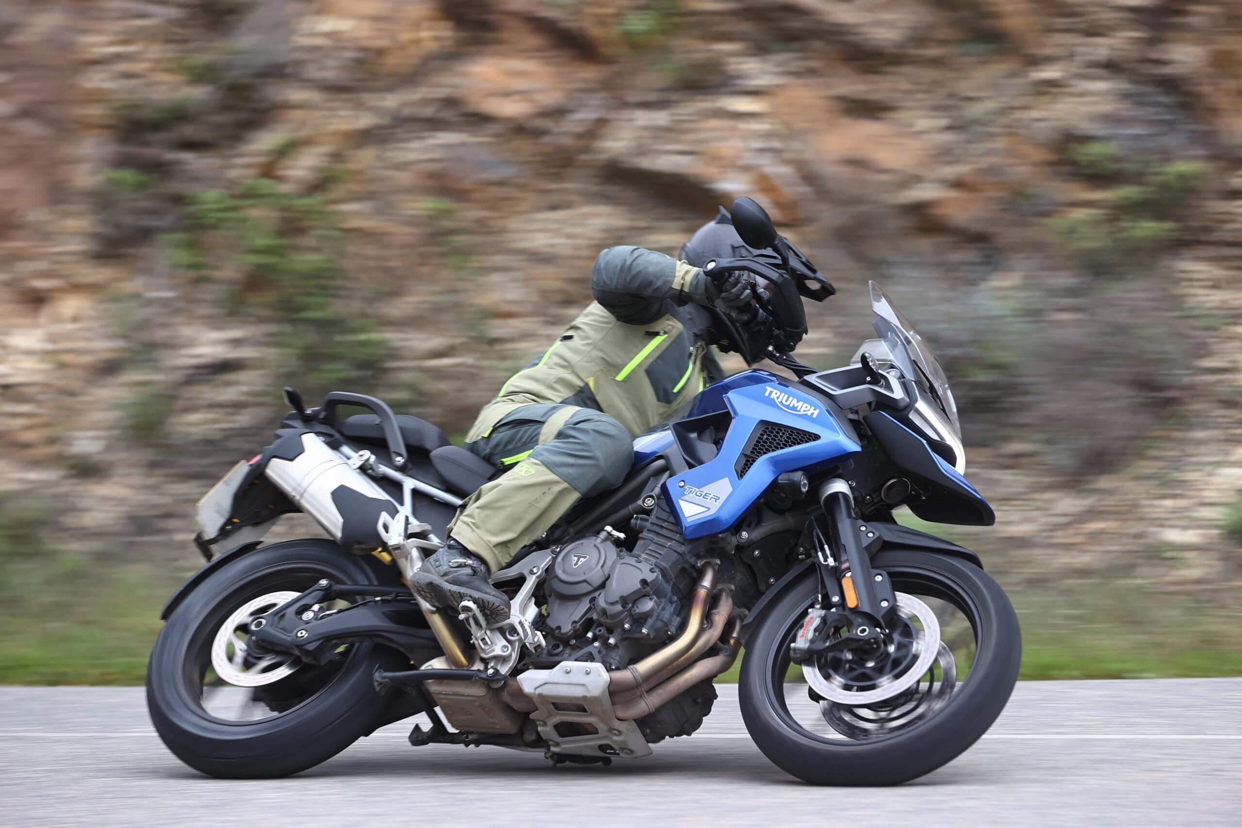 Sur les petites routes du Sud du Portugal, les versions GT et GT pro et leurs jantes de 19 pouces à l’avant se montrent particulièrement intuitives, faciles et rapides à balancer d’un virage à l’autre. Depuis l’arrêt de la Tiger Sport 1050, il n’existait plus de Tiger au comportement aussi sportif à la conduite ! Quand à la version GT Explorer, elle demande un peu plus d’attention. Avec ses 10 litres de carburant additionnés au 20 des versions « légères », le poids supplémentaire se ressent évidemment sur le train avant dans les entrées en courbe ainsi qu’au freinage, puissant au demeurant.
