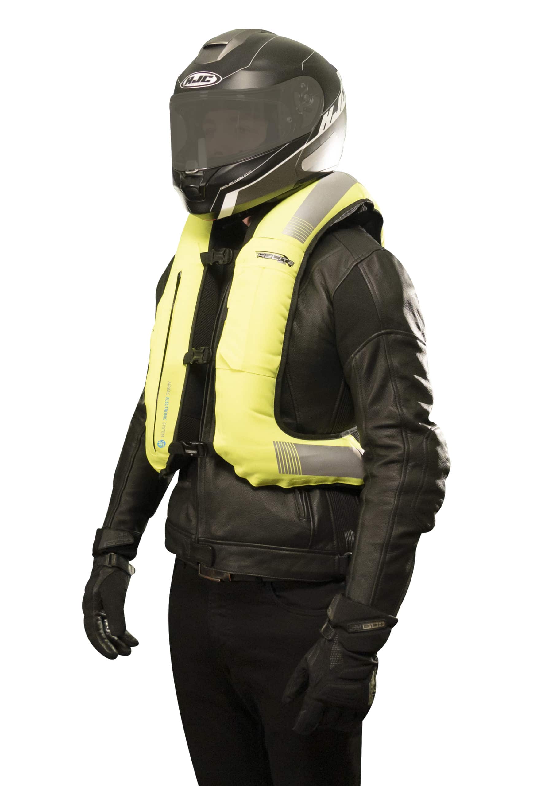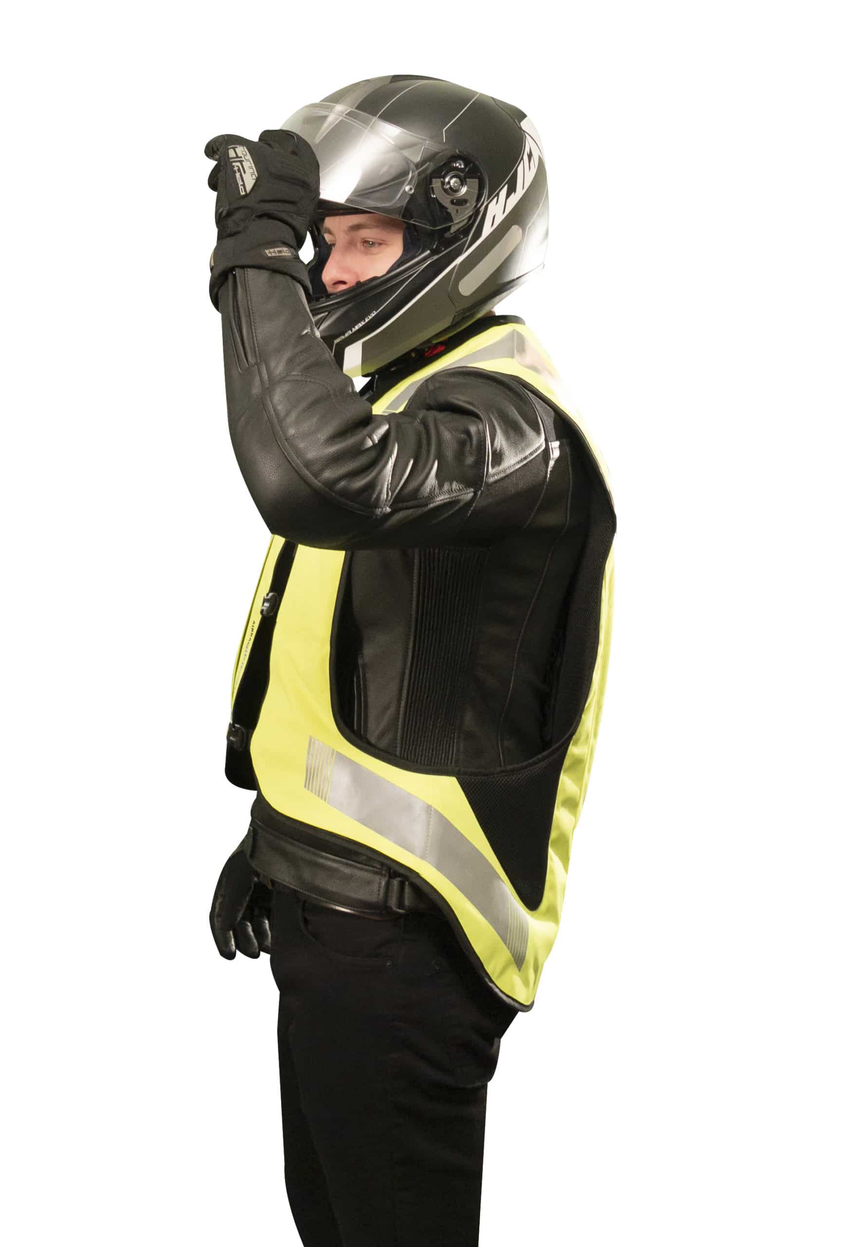 Caractéristiques : Technologie TURTLE avec dorsale SAS-TEC niveau 2 Gros volume de protection : entre 17 et 28L selon la taille de l’airbag Détection sans fil, système 100% autonome Système simple et intuitif Autonomie : 25 heures (chargement USB) Confort : col en néoprène souple Aération : intérieur en MESH 3D Praticité : poche extérieure pour ranger des petits objets : CB, clés... Ajustement : s'adapte sur toutes les vestes et équipement moto grâce aux 3 sangles d’ajustement Visibilité : bandes réfléchissantes dans le dos. Coloris : Existe en couleur jaune hi-vis (haute visibilité) ou noir Composition : Gilet 100% polyester, airbag 100% polyuréthane Certification : Certifié CE par le laboratoire ALIENOR CERTIFICATION, un organisme reconnu qui vérifie et approuve les équipements de protection individuelle pour les motards (EPI). Taille : du XS au XL-L Prix : 689 € (selon vendeurs) Distribution : www.helite.com