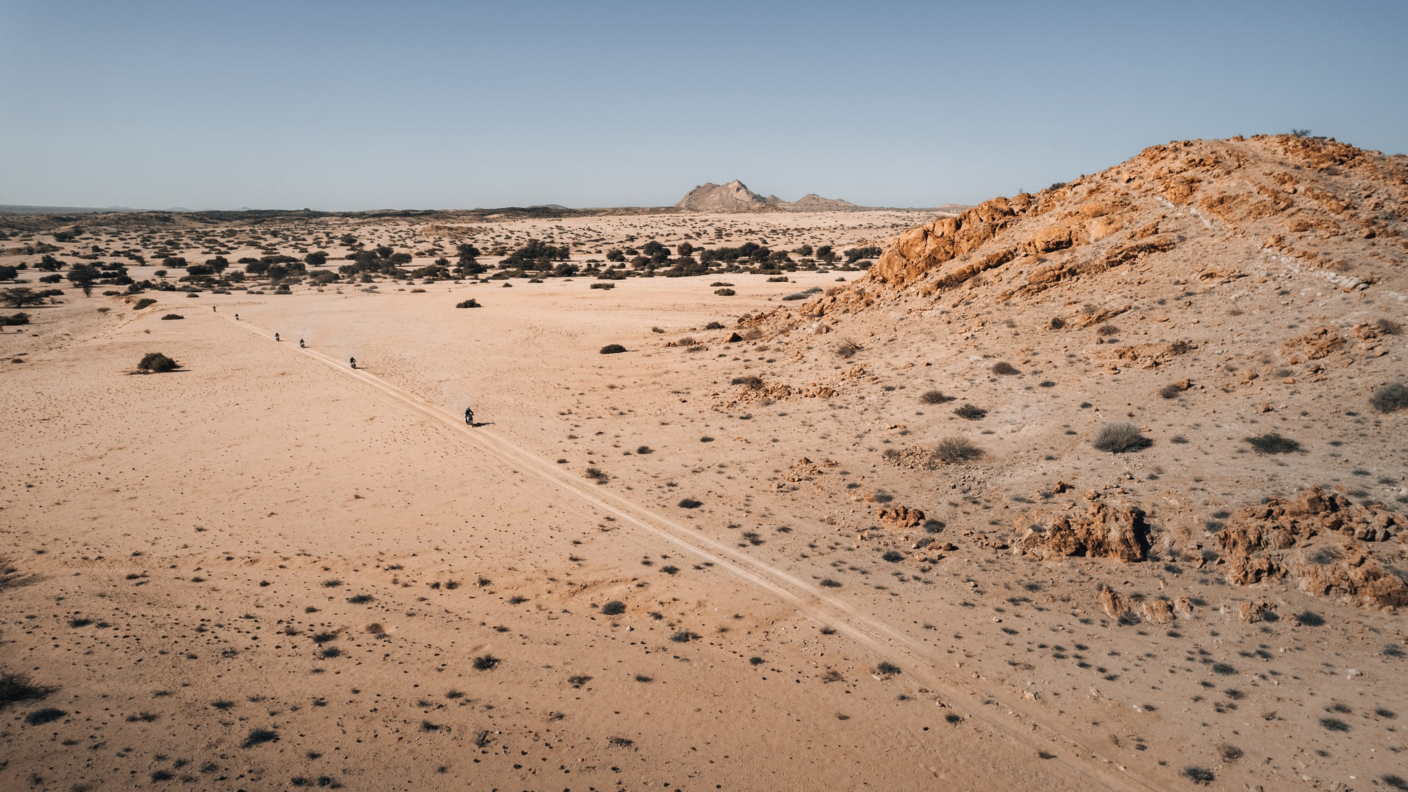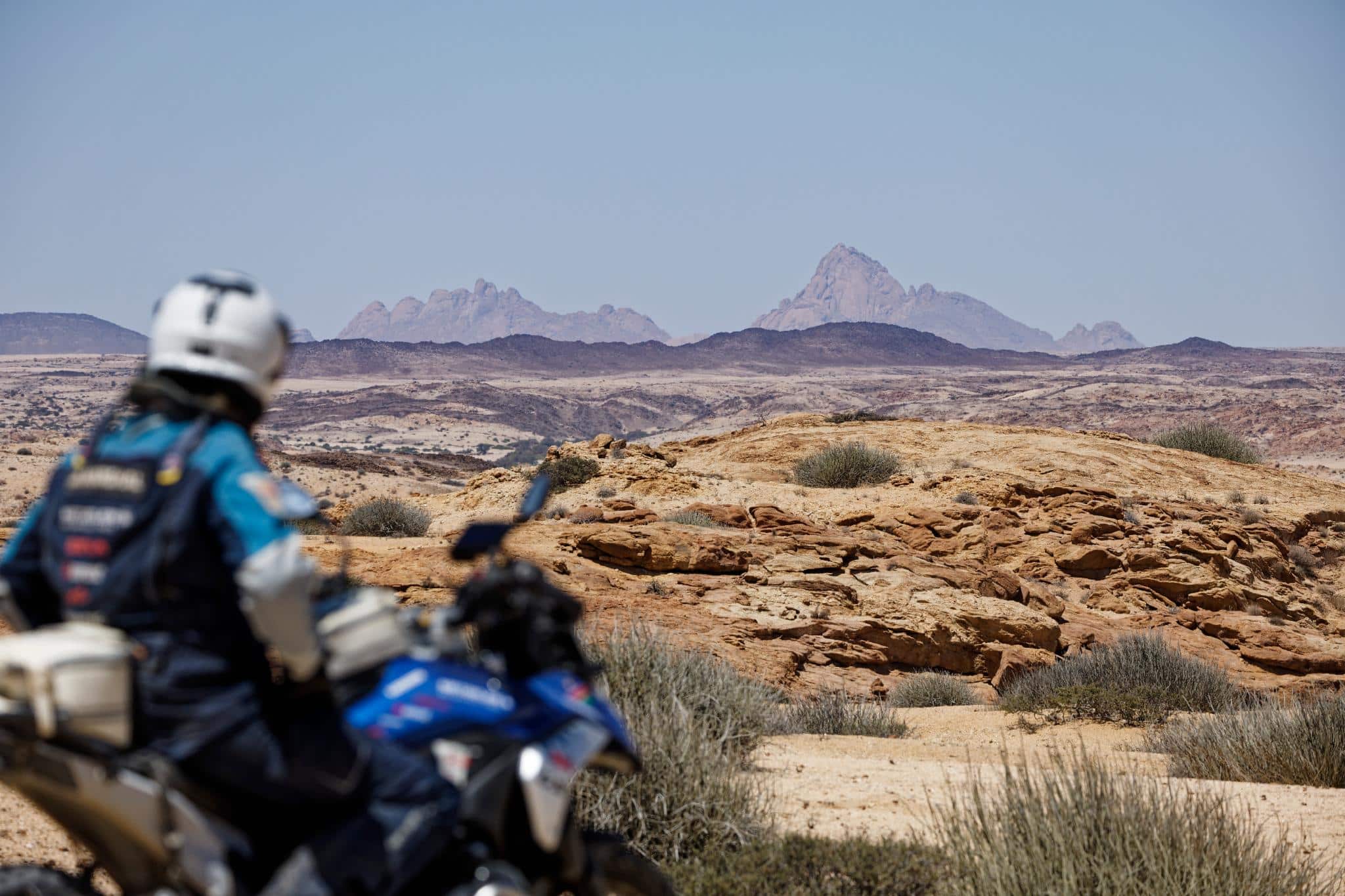 Alors qu’ils retournaient au camp de Spitzkoppe, les pilotes ont été accueillis par une vue imprenable sur la montagne Brandberg au loin. Connue pour la peinture de la Dame Blanche trouvée dans ses grottes, Brandberg est un lieu riche en histoire, autrefois site d’une ville minière.