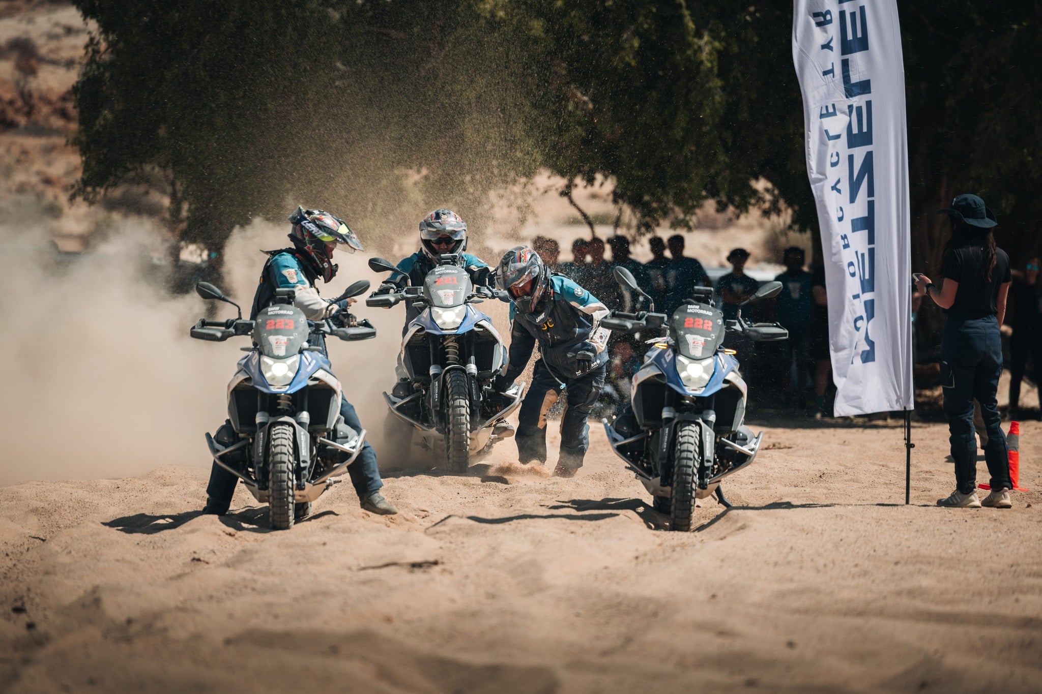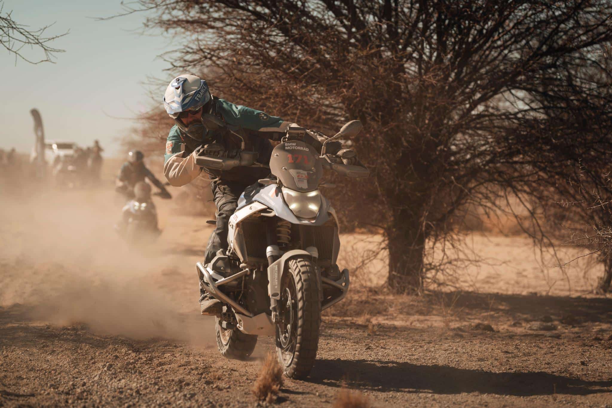 Équipés seulement d’une feuille d’instructions et d’une boussole, les pilotes se sont élancés à pied pour trouver une planche en bois du GS Trophy cachée dans le terrain accidenté autour de Spitzkoppe. Ils devaient suivre cinq étapes pour atteindre leur objectif, prendre un selfie avec la planche, puis revenir au point de départ — tout cela en courant contre la montre. Avec une caméra Insta360 capturant chacun de leurs mouvements, les pilotes bondissaient sur les rochers et à travers des sentiers étroits, scrutant le terrain à la recherche d’indices. Le défi testait leurs compétences en navigation, leur sens de l’orientation et leur rapidité, tout en subissant la pression du temps.