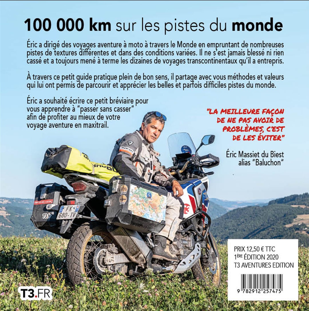 Avec son agence T3, Eric Massiet du Biest a mis sur pied et dirigé de nombreux voyages moto à travers le monde. « Sans me blesser et en menant à terme toutes mes expéditions » précise-t-il. Cette solide expérience du terrain et du pilotage moto, il entend aujourd’hui la partager à travers un petit bréviaire. Celui-ci détaille, poste par poste, pour apprendre à aller loin et surtout « passer sans casser » pour reprendre ses mots. Didactique, clair, bien illustré, complet et commenté avec un sens de la formule qui fait mouche.