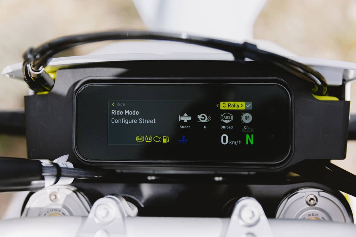 La 701 Enduro 2026 adopte un tableau de bord TFT 4,2 pouces en format paysage, avec connectivité via l’application Ride HQV (musique, appels, navigation). Depuis le guidon, le pilote peut sélectionner différents modes de conduite et régler l’antipatinage (MTC) ou l’ABS.