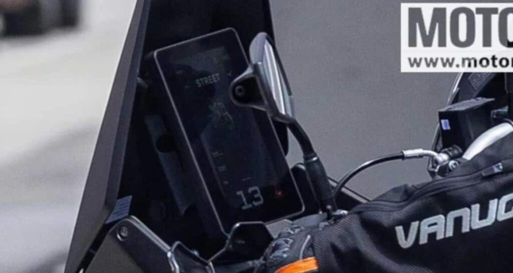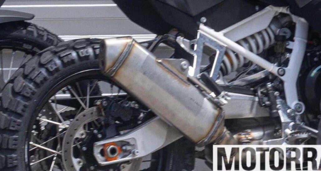 Le bras oscillant laisse passer le coude d’échappement sous celui-ci, ce qui le rendra fatalement plus exposé, comme sur les BMW F 900 GS ou la Suzuki 800DE. L’amortisseur est toujours en position longitudinale, mais celle-ci semble encore plus accentuée que par le passé. Le cadre semble lui aussi grandement affiné, sans doute grâce au déplacement du catalyseur sous la moto.  Une affaire que nous suivrons avec intérêt, jusqu’à la sortie du modèle.
