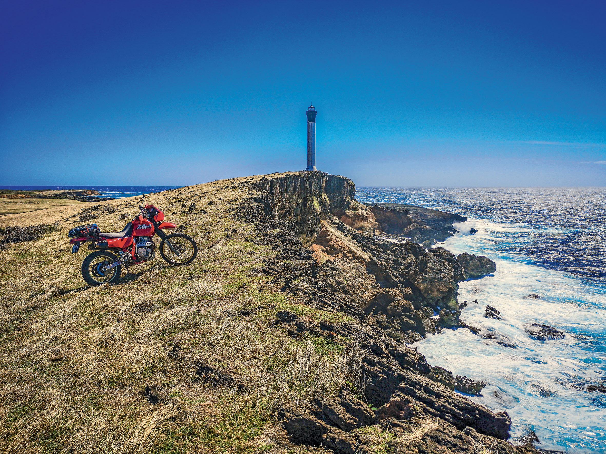 Malgré son âge avancé, le monocylindre ronronne avec régularité et inspire confiance. Et avec ses airs de grosse moto d’enduro, la piste ne lui fait pas peur ! Et puis les 70 premiers kilomètres depuis Antsiranana ne présentent aucune difficulté. C’est parti ! Arrivé au bout du bout de la pointe nord de Madagascar, un phare de 32 m de hauteur se dresse fièrement. Il se grimpe en quelques minutes pour dévoiler, une fois en haut, l’océan Indien à sa droite et, à sa gauche, le canal du Mozambique.