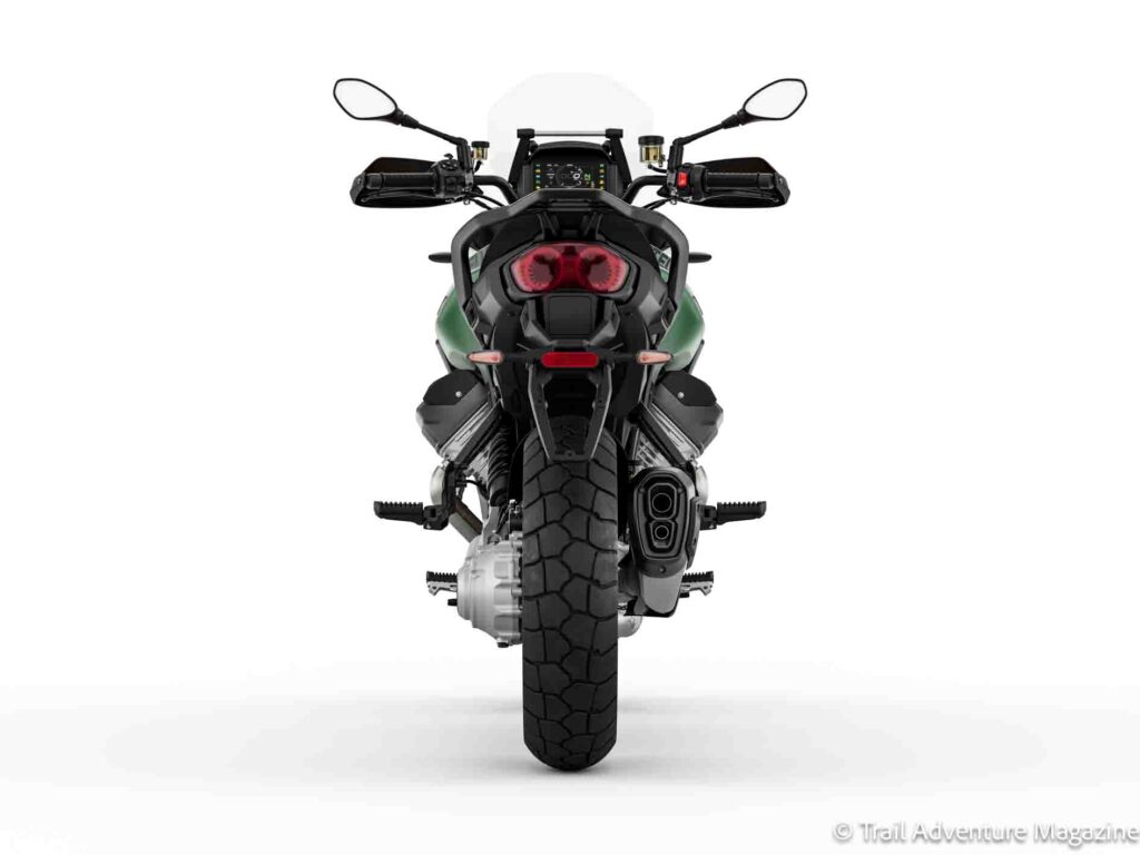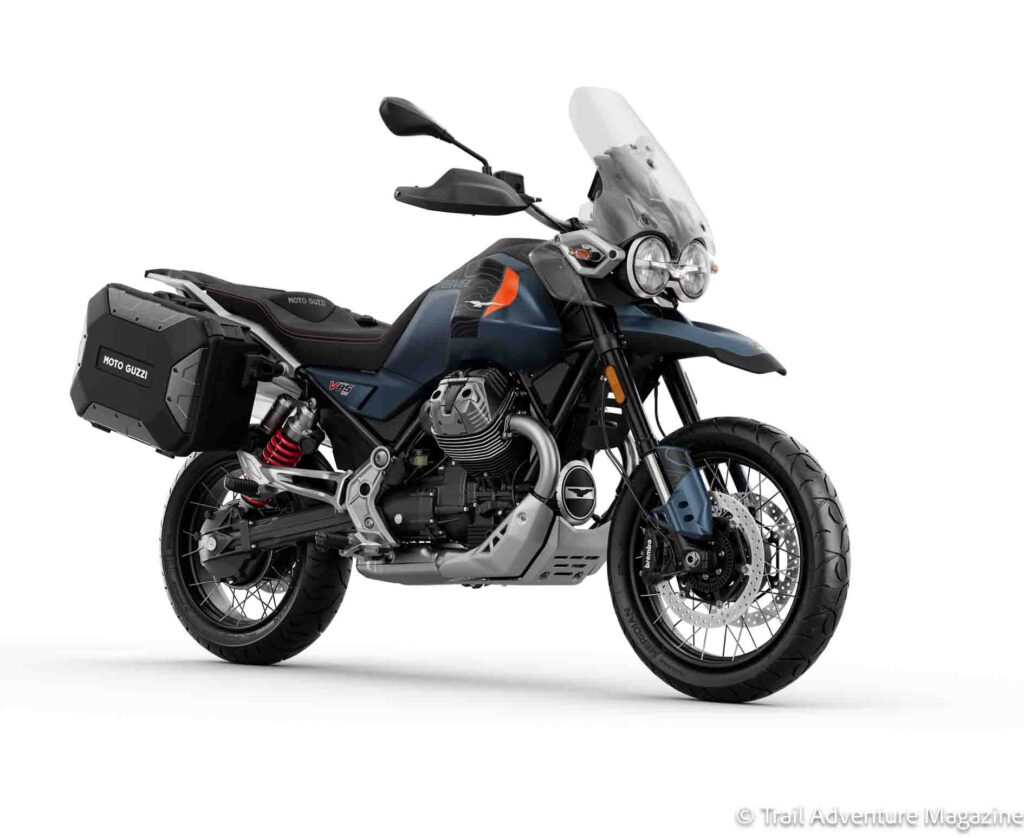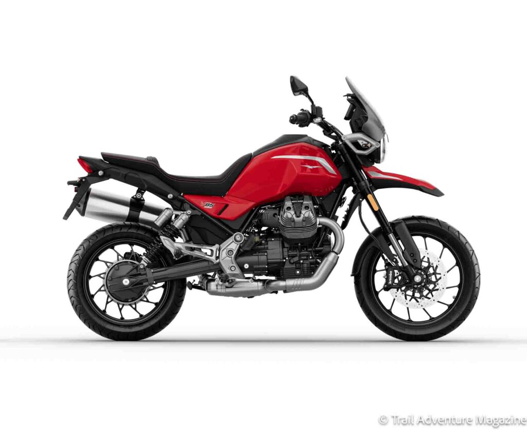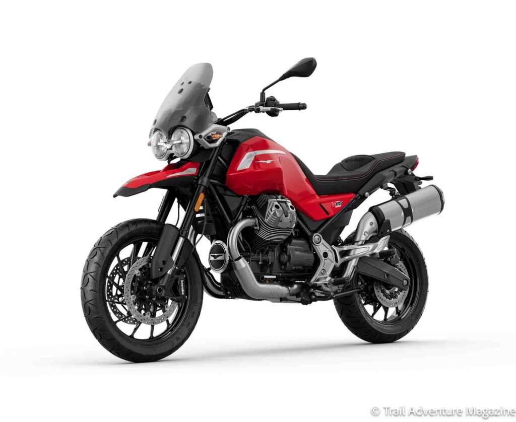 - La Moto Guzzi V85 Strada, version la plus orientée route, reçoit un équipement de série revu à la hausse, avec un positionnement renforcé sur les longs trajets. Elle se décline désormais en Vert Legnano et Rouge Monza.