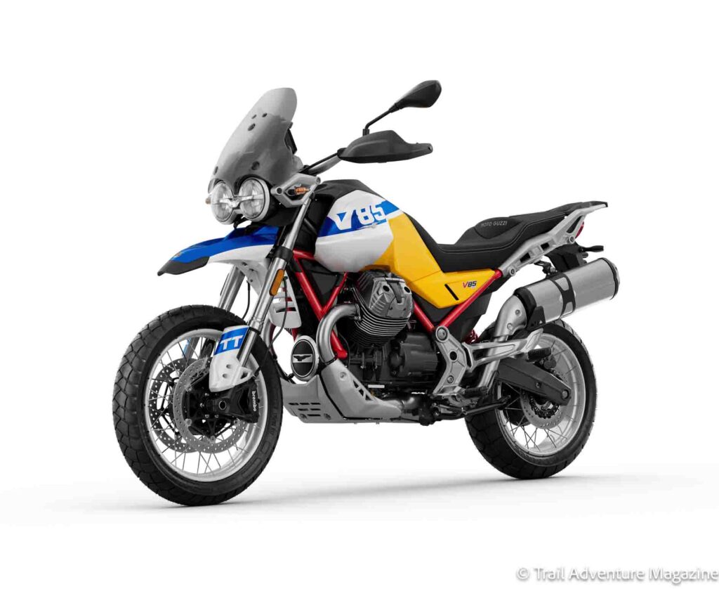 - La Moto Guzzi V85 TT, modèle polyvalent de la gamme, est proposée dans les nouvelles teintes Jaune Wadi et Gris Yanar Dag.