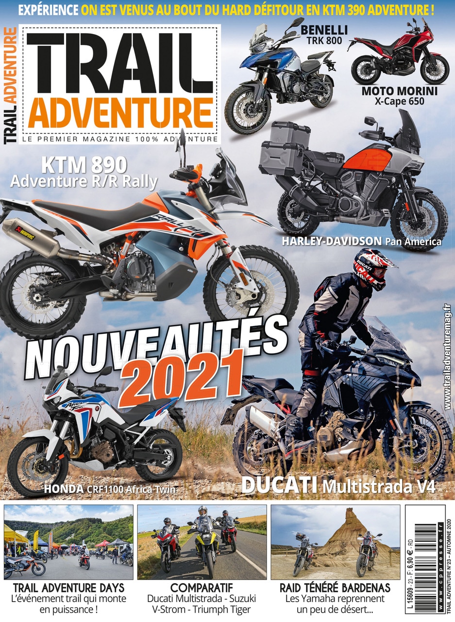Dans ce numéro, découvrez toutes les nouveautés 2021. Vous trouverez également la confrontation de trois motos performantes et très bien équipées : La Ducati Multistrada 950 S, la Suzuki V-Strom 1050 XT et la Triumph 900 GT Pro. Envie de voyager ? Pas de soucis, on vous emmène en week-end découvrir le paysage discret et sauvage du Haut-Jura. Retour sur les événements de la rentrée, le 4e Alpes Aventure Motofestival, ainsi que le Trail Adventure Days. Pour compléter ce numéro, voici un portrait de Philippe Degletagne ancien pilote de chasse et passionné de deux roues. Enfin jetez un oeil sur l’agenda des événements à venir… sans oublier toutes nos bonnes adresses de shopping !