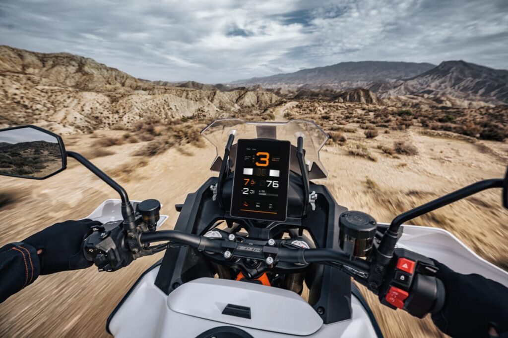 La KTM 1390 SUPER ADVENTURE R bénéficie également d’un tableau de bord vertical de 8 pouces entièrement tactile. Cet écran utilise une technologie inductive, permettant une utilisation facile même avec des gants d’hiver épais ou des gants tout-terrain. L’écran intègre un revêtement anti-reflets, anti-traces de doigts et anti-éblouissement, améliorant ainsi sa lisibilité. Il donne également accès à de nouveaux modes de conduite, à la navigation intégrée et à des fonctionnalités connectées.