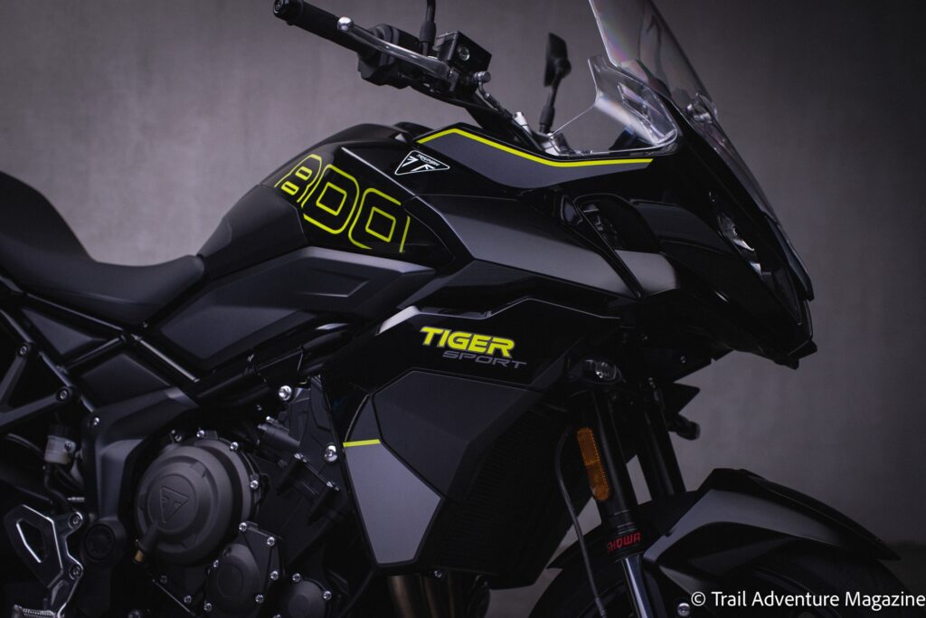 Combinée à un châssis présenté comme sportif et équipé de suspensions Showa réglables, la Tiger Sport 800 promet aussi une conduite dynamique, même sur de longues distances. Pesant 214 kg tous pleins faits, elle conserve les dimensions compactes et le carénage de la version 660. Celui-ci inclut une tête de fourche avec une bulle haute, ainsi que des déflecteurs enveloppant le réservoir. en revanche, elle ne dispose toujours pas de porte-paquet.