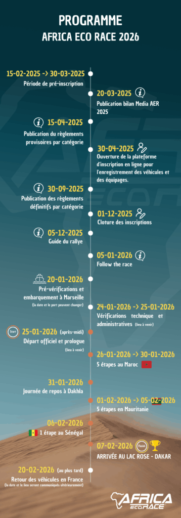 L’attente est terminée : le parcours de l’Africa Eco Race 2026 est désormais connu. Cette édition marque une évolution majeure avec un tracé repensé, plus audacieux et plus vivant, fidèle à l’esprit du rallye africain. Les participants traverseront une nouvelle fois le Maroc, la Mauritanie et le Sénégal, sur des pistes mythiques où la navigation reste reine.