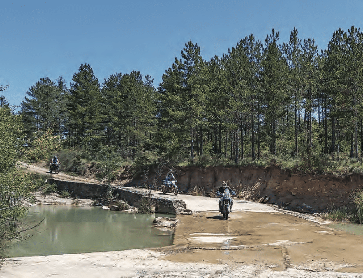La boucle du jour offre une bonne mise en jambes avec des pistes larges, du relief. Et différentes textures de terrain allant de la terre à la caillasse en passant par du petit gravier bien roulant. Sans oublier un ou deux petits passages techniques. De quoi se remémorer les principes essentiels de la conduite moto tout-terrain. Et, surtout, garder en mémoire que prudence et respect des autres utilisateurs constituent la base de notre philosophie. Chacun roule à son rythme et profite des formidables paysages qu’offre la Navarre. Entre collines sculptées en terrasses par les cultures de céréales et surplombées de villages médiévaux, forêts et bois ou serpentent de superbes pistes , rivières et lacs auprès desquels on retrouve une relative fraîcheur, il y a de quoi se régaler. Pour autant, le pilotage tout-terrain demande une attention de tous les instants. Et comme souvent, une petite erreur peut avoir de lourdes conséquences. Zaza en fera les frais et terminera cette première journée un bras en écharpe. Dans le fourgon d’assistance improvisé grâce à Harvey et Richard. La solidarité n’est pas non plus un vain mot au sein de l’association Ténéré Spirit.