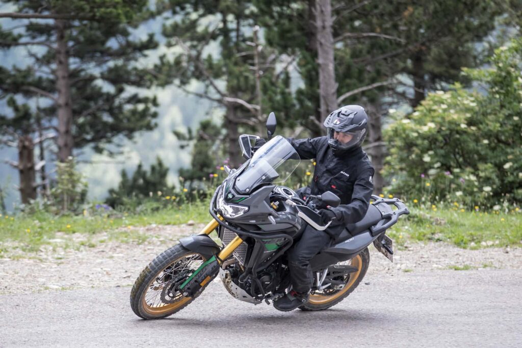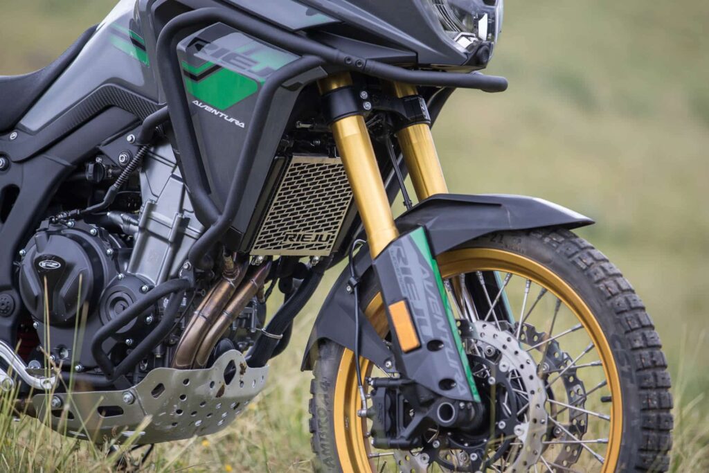 Du côté de la partie cycle, le fabricant espagnol coche toutes les bonnes cases, sur le papier tout du moins : jantes tubeless en 21 et 18 pouces, débattement suffisant de 190 mm, fourche inversée réglable en détente, compression et précharge, mono-amortisseur arrière à biellettes progressif entièrement réglable lui aussi, amortisseur de direction, bras oscillant en aluminium, repose-pieds crantés, guidon large… mais que reste-t-il aux grandes ! L’ensemble est même protégé d’office par de multiples protections (sabot aluminium, crash-bars latérales, protège-mains, béquille centrale…). Enfin le frein avant à double disque utilise des étriers à double pistons à fixation radiale, tandis que l’ABS du frein arrière est déconnectable pour un usage tout-terrain.