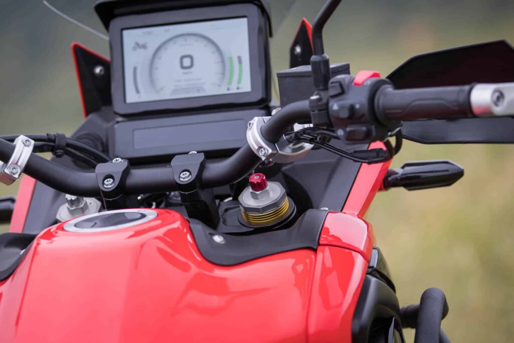 À bord, pas d’autres assistances électroniques. Derrière la bulle de hauteur conséquente, on trouve en revanche un tableau de bord TFT de 7 pouces, autorisant la mise en miroir des applications de votre smartphone type Waze, Google Maps ou OsmAnd : que demandez-vous de plus sur une moto dont le prix de lancement est fixé à 7 399 euros ? Enfin l’ensemble devrait aussi s’avérer confortable avec une épaisse selle en deux parties, mais assez haute (840 mm), mais cela, on vous le confirmera lors d’un prochain essai !