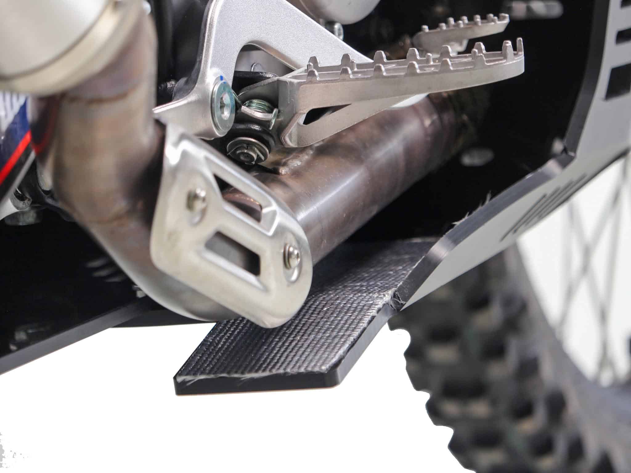 Le sabot intègre plusieurs détails pratiques, comme une mousse anti-friction au niveau du réservoir pour limiter l’usure due aux frottements, et un sticker pare-chaleur tout le long de l’échappement, empêchant toute surchauffe ou fonte des matériaux. Des aérations en façade permettent un refroidissement optimal du moteur, tandis qu’une cale de renfort intermédiaire avec appui sur le cadre est ajoutée pour prévenir les écrasements lors de chocs importants.