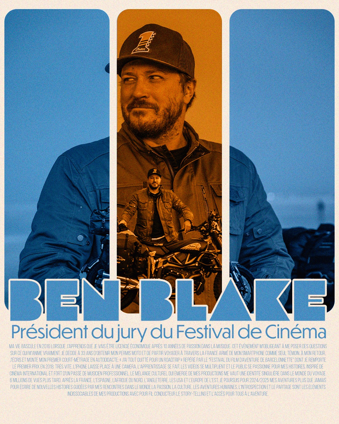 Aventurier vidéaste et globe-trotter aguerri, Ben Blake incarne l’esprit du voyage et de la liberté sur deux roues. Ses récits captivants, immortalisés dans des vidéos mêlant esthétique et émotion, lui ont valu une audience internationale ainsi qu’un bel article de présentation dans notre titre Voyages à Moto. En tant que président du jury, Ben Blake apportera son expérience et son regard unique, afin de guider les choix du jury.