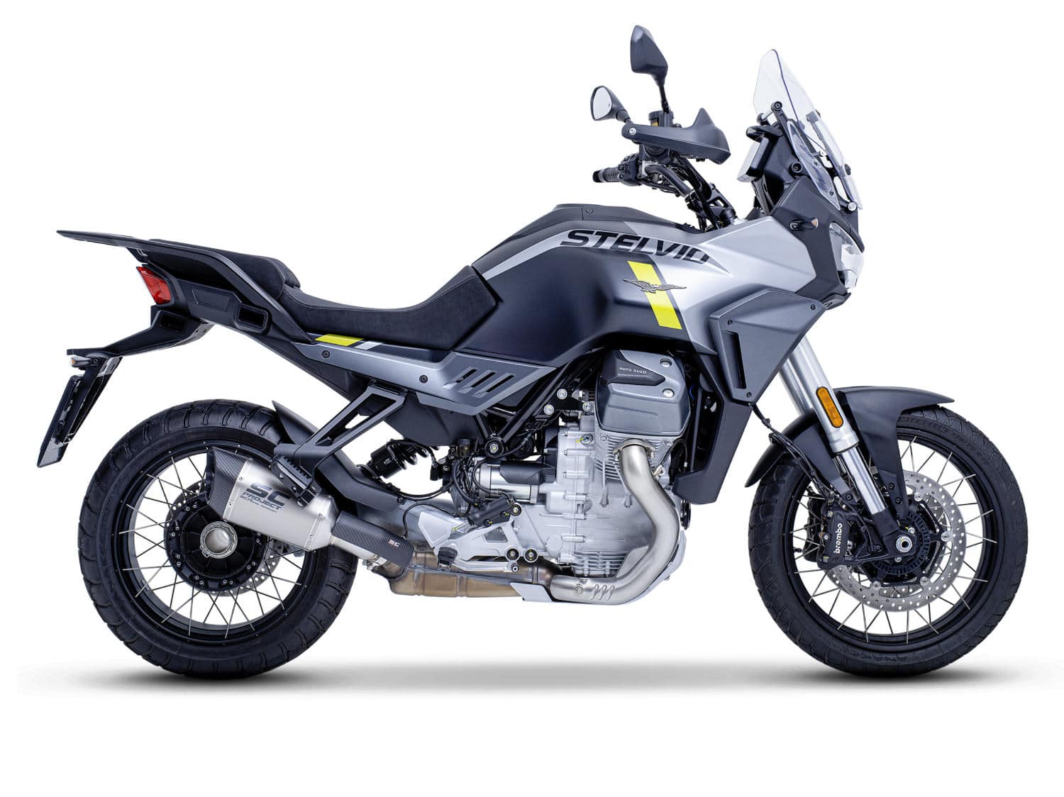 Le silencieux SC1-R est spécialement conçu pour les modèles routiers et trails comme la Stelvio. Il présente un design compact, adapté à la bagagerie rigide, et améliore l’agrément de conduite tout en préservant la sonorité caractéristique du bicylindre en V. Homologué Euro5+, il offre des gains notables en performance avec une augmentation de couple de +1,5 Nm à 6100 tr/min et de puissance de +1,4 ch à 6100 tr/min. Le poids est réduit de 35 % par rapport à l’échappement d’origine. De plus, le silencieux est compatible avec les valises d’origine.