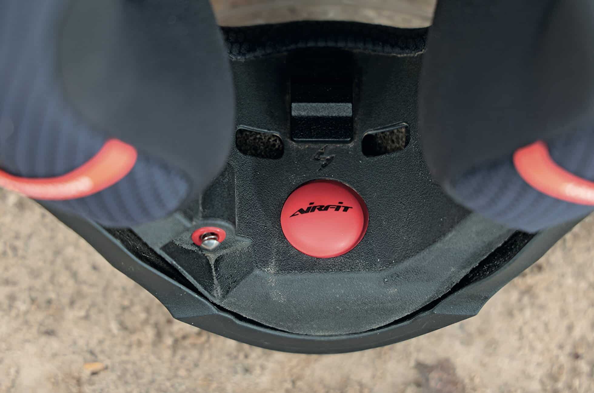 L’Airfit Concept permet d’ajuster les mousses internes grâce à des coussins d’air gonflables situés entre celles-ci et la coque. La pompe, intégrée à la mentonnière, est toutefois un peu trop proche de la bouche.