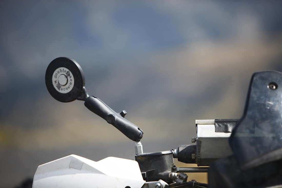 Obligatoires en cas de contrôle de la maréchaussée, mais surtout indispensable pour votre sécurité, les rétroviseurs sont un réel souci lorsque l’on engage son trail dans la pratique du tout-terrain un tant soit peu engagée. Pensés pour la conduite assise, les éléments d’origine gênent bien souvent les bras ou les poignets en conduite debout. Et à la moindre chute, ils se tordent, se dévissent ou cassent carrément quand ils ne détruisent pas votre maître-cylindre ou la fixation de votre commande d’embrayage ! Pas cool… Pour parer chacun de ces problèmes, Earl, Katie et Ned de la firme américaine Doubletake Mirror ont imaginé un rétroviseur incassable. Construits dans le Colorado depuis 2009, ces miroirs convexes intégrés dans une coque en nylon Zytel sont garantis à vie et ce n’est pas leur seul avantage.