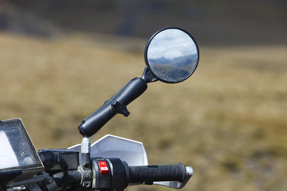En utilisant un système d’assemblage par boule et bras Ram Mount avec une seule vis de serrage, chaque rétroviseur est rapidement ajustable à volonté ou repliable au plus près du guidon, pour traverser une forêt par exemple. En cas de chute ou de coup avec les avant-bras, ce même système offre la flexibilité suffisante pour déformer l’ensemble sans jamais casser. Enfin, les extrémités caoutchoutées de chaque boule s’avèrent capables de filtrer une bonne partie des vibrations. Si c’est la taille du bras de serrage Ram qui va déterminer la longueur de votre rétroviseur et votre angle de vision (plusieurs dimensions au choix), deux formes de miroir (ronde ou polygonale) existent aussi. Le dernier né, baptisé Scrambler, présente une forme ronde passe partout et un bras assez court.