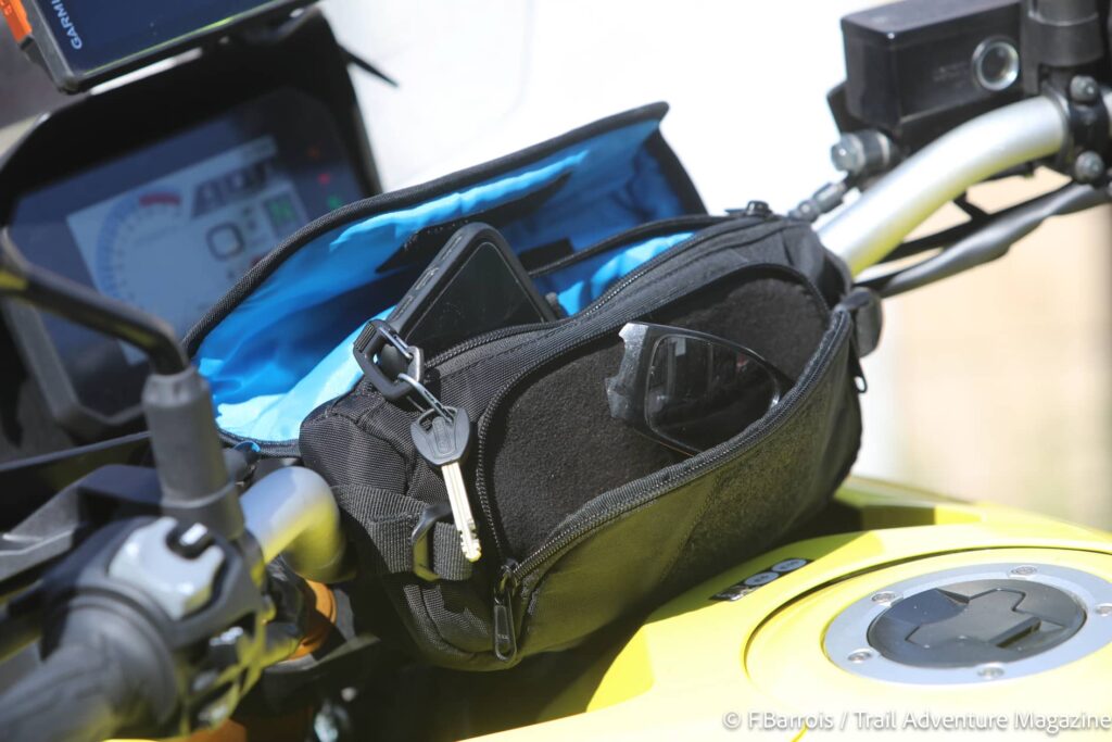Tel un mille-feuilles, celles-ci révèlent d’autres rangements pour bien organiser vos petits objets. On y trouve aussi un filet et un mousqueton pour les clés. Une troisième poche séparée a même été doublée en tissu polaire, pour ne pas rayer par exemple votre téléphone ou vos lunettes. Sur la partie inférieure, il y a un petit passe-câble pour éventuellement recharger vos objets connectés. Sachez aussi qu’une pochette transparente avec rabat pour votre smartphone est aussi disponible en option. Celle-ci se fixe via le système militaire Molle, mais vous pouvez également y glisser plein d’autres babioles à condition qu’elles ne soient ni pointues, ni coupantes. Malheureusement, cette housse n’ayant pas de propriété étanche, son usage est à réserver aux motos équipées d’une protection suffisante.