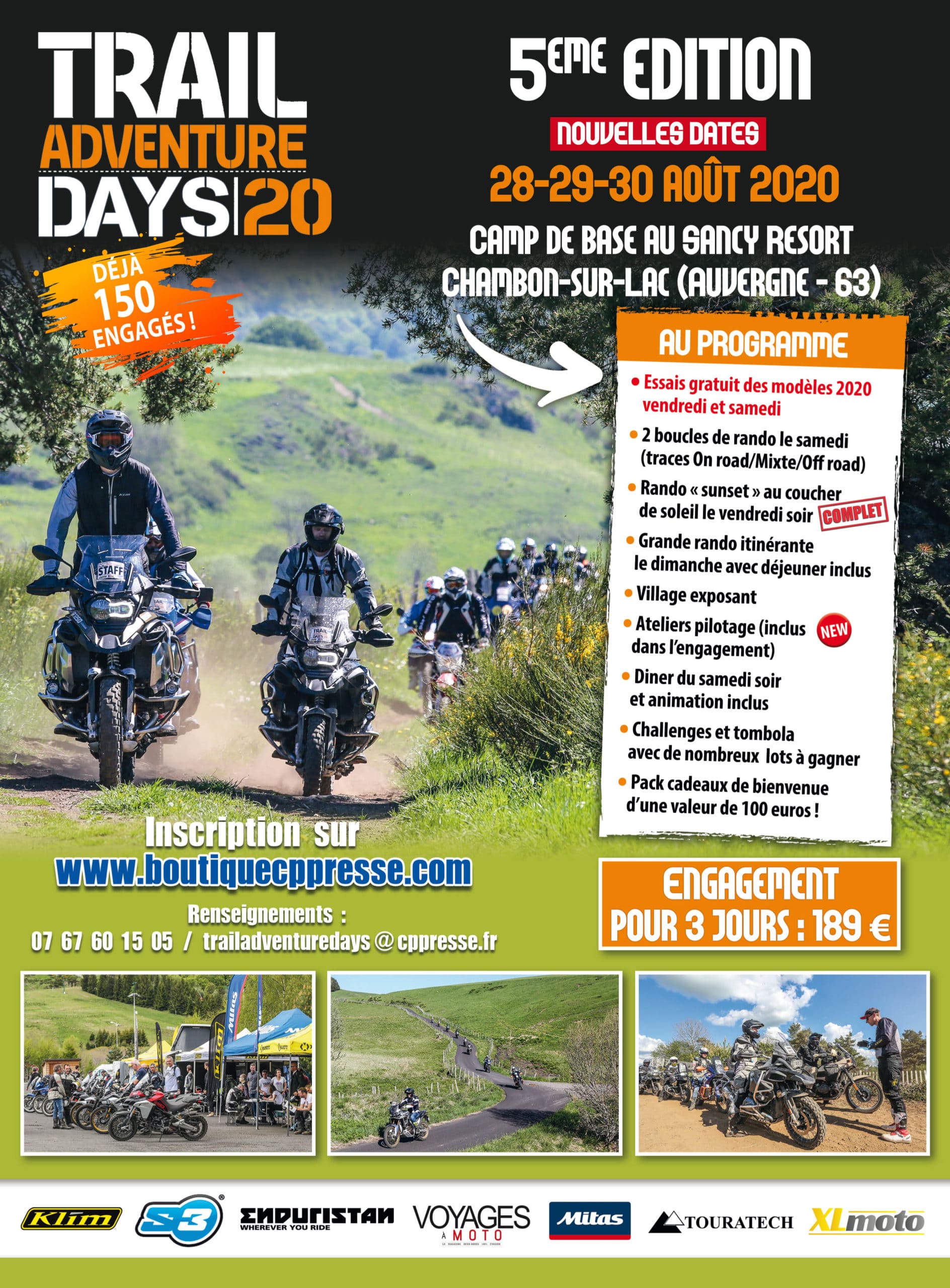 Le rassemblement annuel des Trail Adventure Days étaient programmé, comme chaque année, au mois de juin (du 12 au 14) et on a voulu y croire jusqu’au bout, mais devant les mesures de déconfinement et les incertitudes, nous avons été contraints de reporter les festivités à une date ultérieure. Toute l’équipe vous donne donc rendez-vous les 28, 29 et 30 août prochains au même endroit, au Sancy Resort, à Chambon-sur-Lac dans le Puy-de-Dôme (63). L’Auvergne sera alors désertée par les derniers vacanciers, le must pour s’aventurer sur ses hauteurs ! Si la beauté du Sancy mérite à elle seule le déplacement, côté programme, il y a aura aussi de quoi se faire plaisir : essai de la production des motos trail 2020 les vendredi après-midi et samedi toute la journée, randonnée au coucher du soleil le vendredi soir (places limitées, déjà complet, sorry !), trois randos en boucle, avec différents niveaux, tracées par l’organisation le samedi… Le site accueillera également un village des exposants afi de profiter des essais de machines, de découvrir des produits pour vos aventures, de participer à des ateliers d’apprentissage.