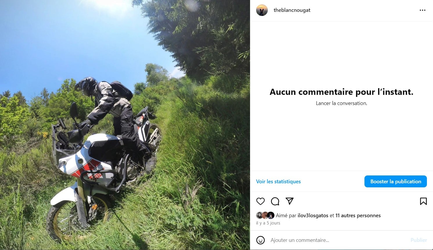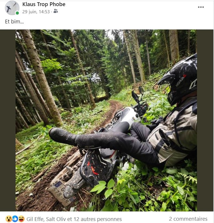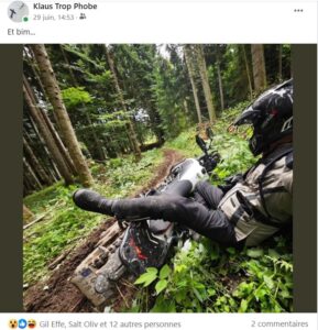 Malheureusement, Wild ou pas, sans la technique adéquate, l’activité enduro en environnement naturel et humide nécessite un certain savoir technique que mon compagnon de fortune n’a pas, et moi non plus. Nous sommes pourtant persuadés du contraire, évidemment. OK, il eut été possible de choisir des traces (balades préparées par l’excellent organisateur et chargées sur notre GPS) vertes ou bleues, sages et faciles. Mais nous étions venus le couteau entre les dents et la tête pleine de souvenirs de nos exploits moto de jeunesse (au siècle dernier) pour en mettre plein la vue aux milliers  à notre petite douzaine de likeurs. Alors va pour les rouges (pas les noirs, nous ne sommes pas stupides non plus), suffisamment photogéniques et largement faisables à condition d’être équipé de pneus à crampons. Enfin, c’est ce qui est marqué dans le programme qui a été imprimé sur foi d’une météo estivale sans pluie…