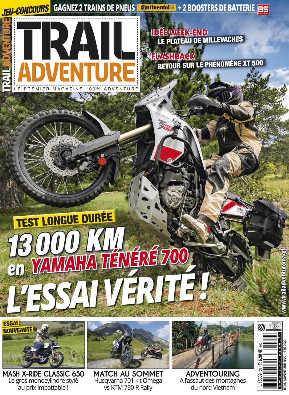 Tout, vous saurez tout sur la nouvelle Yamaha Ténéré 700 ! Durant 7 mois, tous nos collaborateurs se sont succédés au guidon du trail le plus attendu du moment. 13000 km (et 8 chutes) plus loin, le bilan de cet essai longue durée s’est avéré très riche d’enseignements. Dans ce Trail Adventure N°22, vous trouverez également l’essai en avant-première de l’étonnante Mash X-Ride 650 Classic, un gros mono à la sauce scrambler proposé à moins de 5 600 €. Le sport est également à l’honneur avec la confrontation de deux motos d’exception taillées pour la grande aventure : la Husqvarna 701 kit Rally Omega et la KTM 790 R Rally.