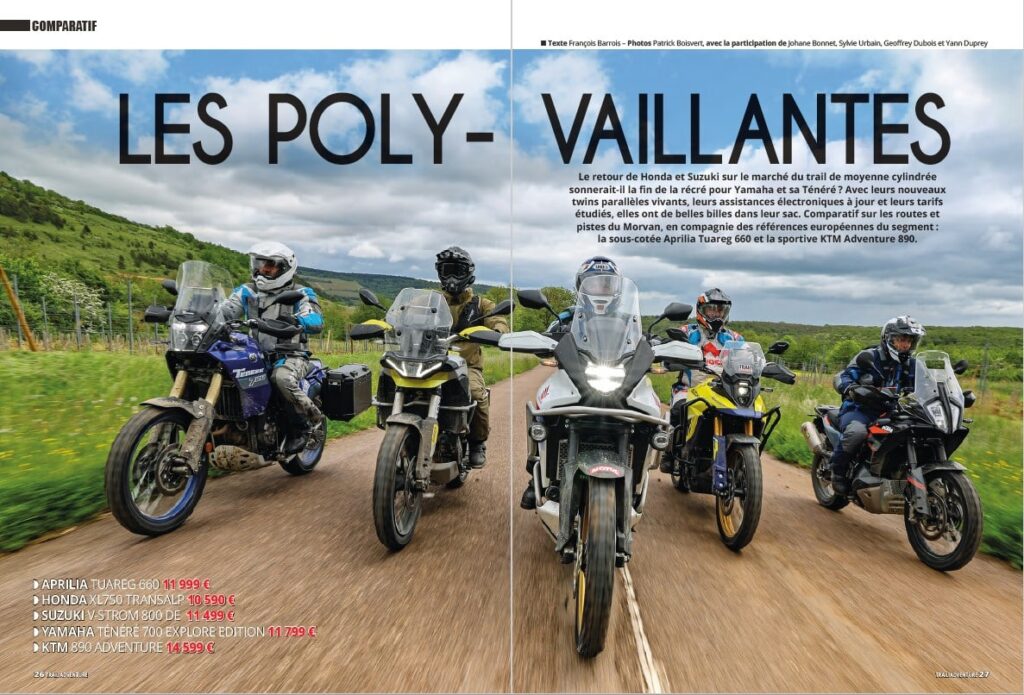 Avons-nous alors affaire au meilleur du trail ? Pour en avoir le cœur net, Trail Adventure a réuni les nouvelles Honda Transalp 750 et Suzuki V-Strom 800 DE afin de les opposer aux valeurs en place que sont l’Aprilia Tuareg 660, la KTM 890 Adventure et la Yamaha Ténéré 700. Un comparatif capital, car c’est la place de best-seller du marché qui se joue ici !