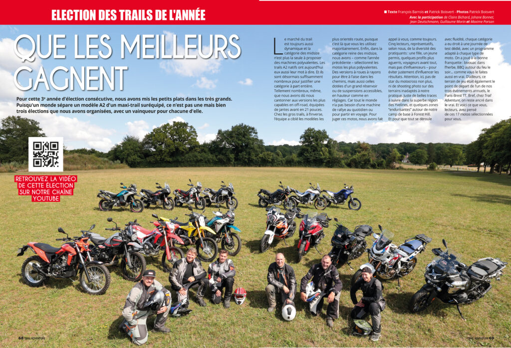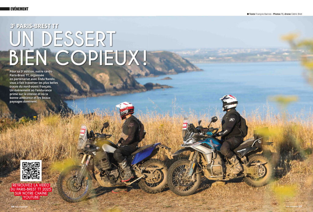 Dans ce numéro : revivez la 10ᵉ édition des Trail Adventure Days, partez à la découverte des nouveautés Rieju Xplora 707 et Morbidelli T1002VX, et testez les limites des BMW R12 G/SKTM 390 Adventure R et Voge DS800X Rally. En route aussi pour le Paris–Brest TT, une rando mythique du nord-ouest, avant de rencontrer Mathilde et Nicolas, deux voyageurs qui ont troqué la voiture pour la moto. Enfin, parmi nos 132 pages, retrouvez aussi notre désormais traditionnelle élection du trail de l’année, avec 3 catégories et 17 nouveautés motos comparées par vous et pour vous !