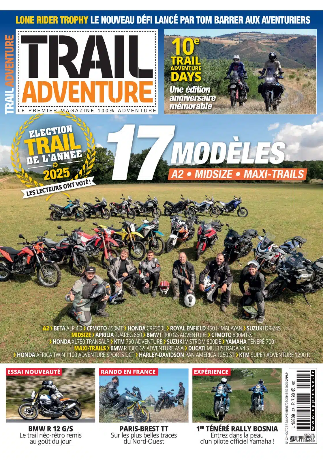 Dans ce numéro : revivez la 10ᵉ édition des Trail Adventure Days, partez à la découverte des nouveautés Rieju Xplora 707 et Morbidelli T1002VX, et testez les limites des BMW R12 G/SKTM 390 Adventure R et Voge DS800X Rally. En route aussi pour le Paris–Brest TT, une rando mythique du nord-ouest, avant de rencontrer Mathilde et Nicolas, deux voyageurs qui ont troqué la voiture pour la moto. Enfin, parmi nos 132 pages, retrouvez aussi notre désormais traditionnelle élection du trail de l’année, avec 3 catégories et 17 nouveautés motos comparées par vous et pour vous !