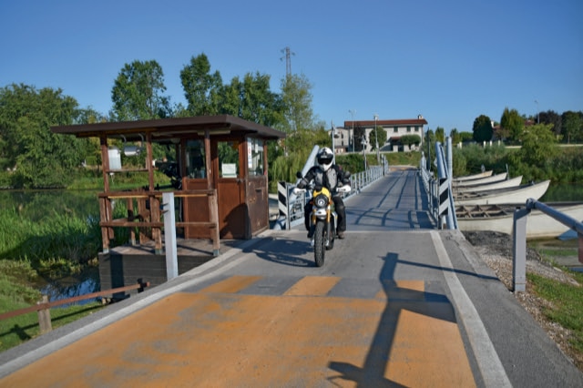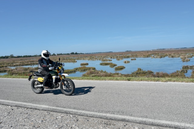 Le départ de notre tour de Vénétie a lieu sur la place du marché de Badoere, dans la province de Trévise, encadrée par de beaux bâtiments agricoles du XVIIe siècle. Au coin de la rue se trouve la Cantina Mediterranea, un restaurant qui a conservé le charme de l’époque. Et qui propose des plats raffinés basés sur la tradition culinaire de la Vénétie. Paola, la propriétaire, suit nos aventures à moto depuis deux décennies et nous sert toujours un de ses excellents cafés avant de nous laisser partir. Le plaisir est toujours le même… Nous traversons la zone plate de la Marca Trevigiana sur d’étroites routes de campagne en direction de Quarto d’Altino.